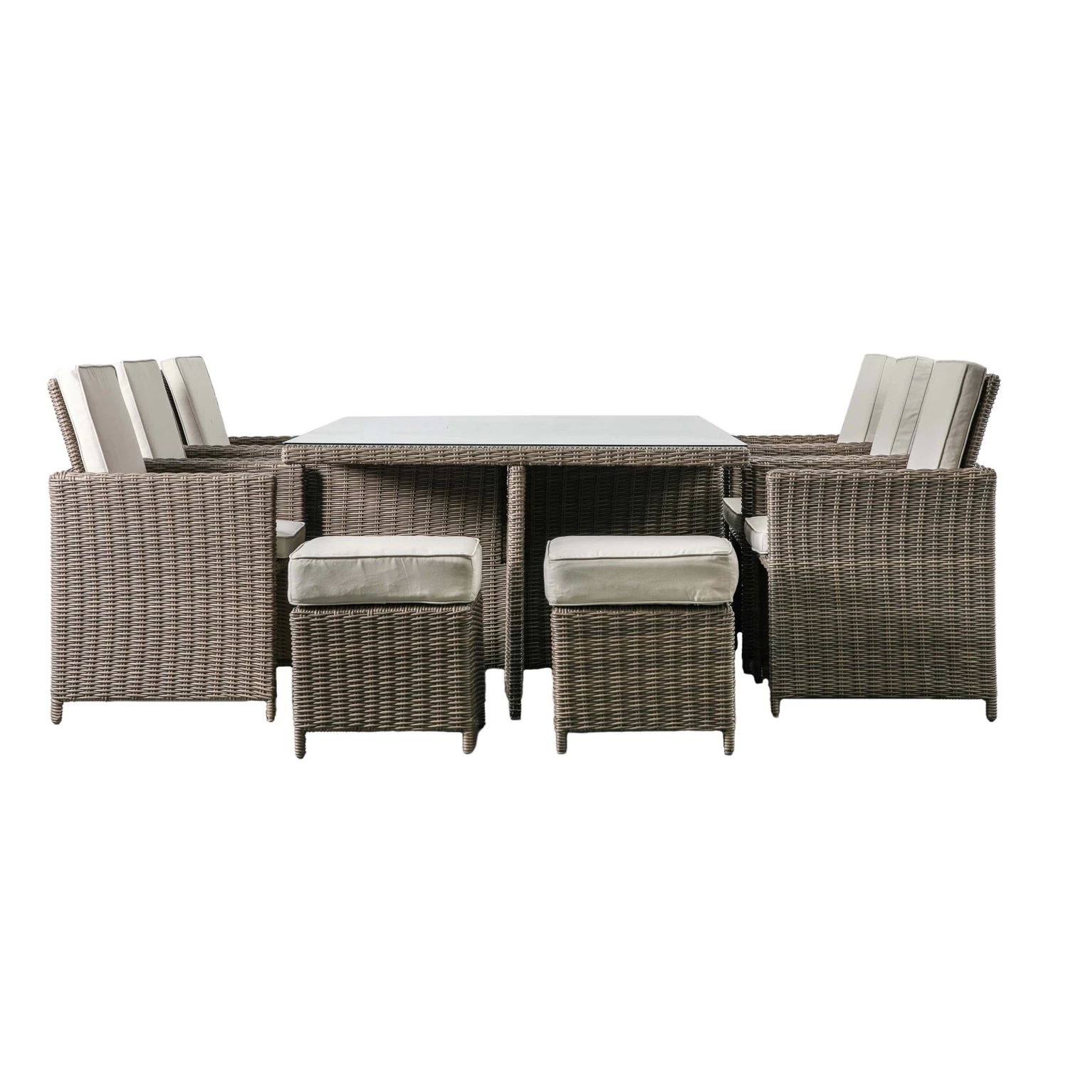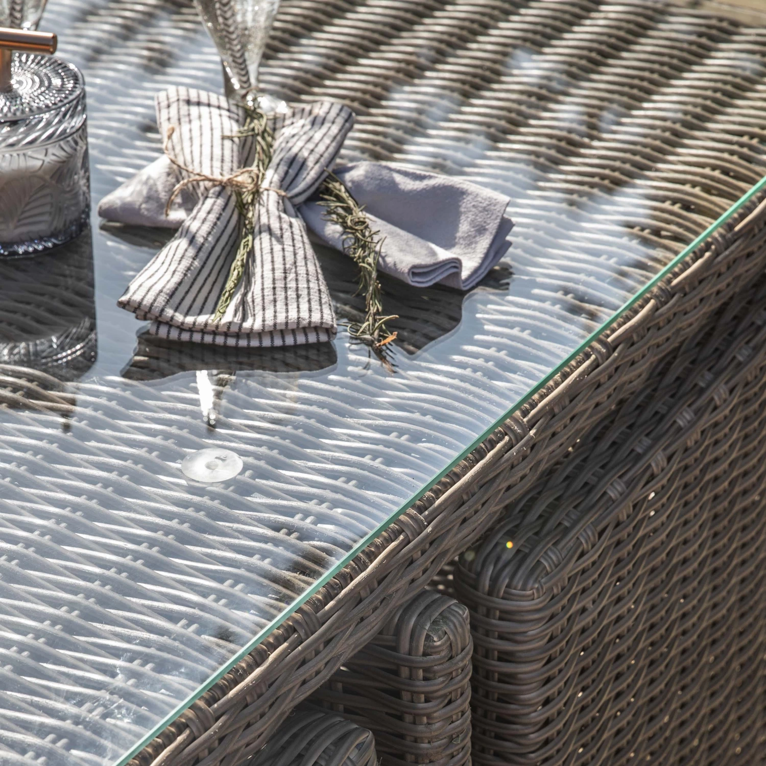 For comfort, the chairs and stools have luxurious showerproof cushions in a soft grey colour to complement the colour of the rattan.