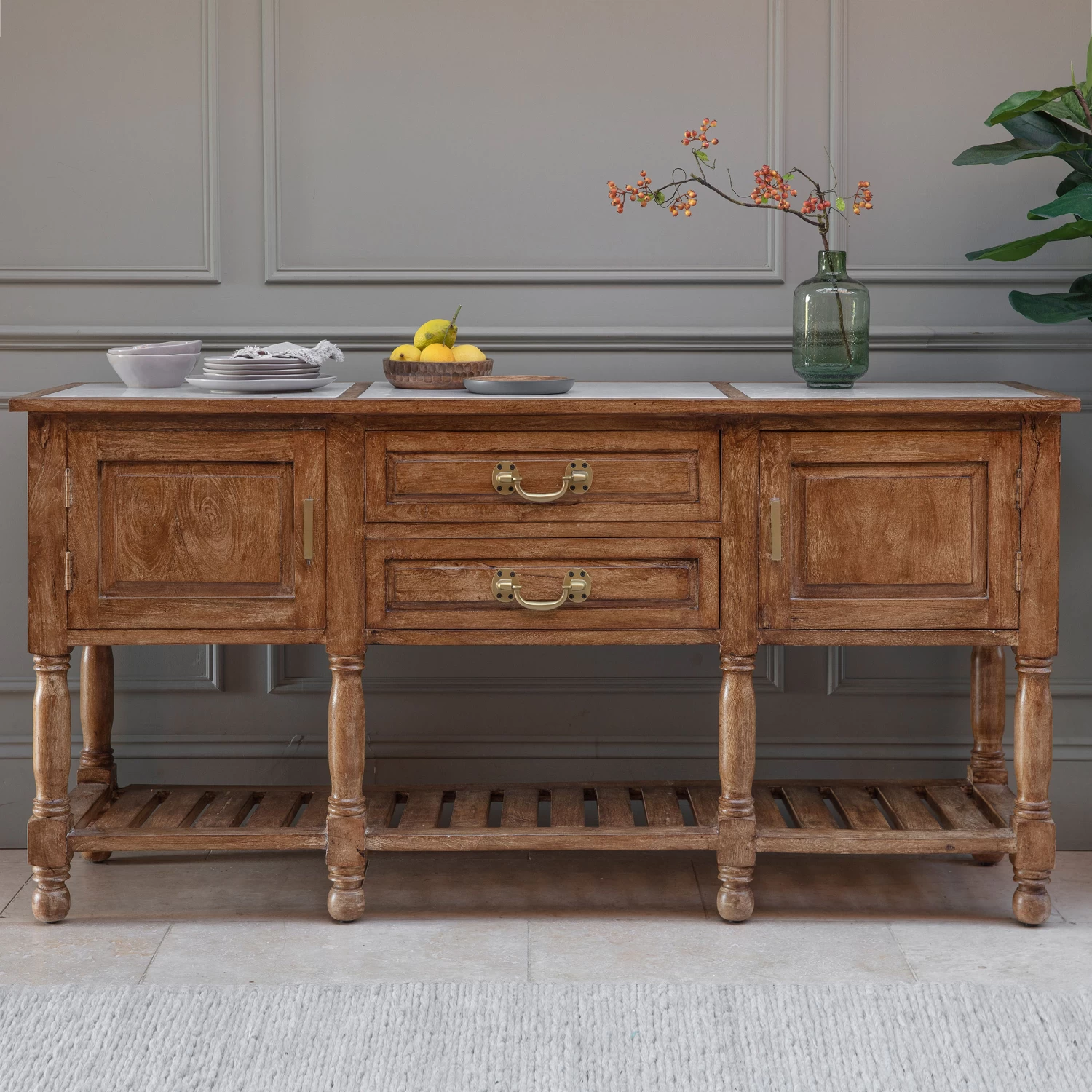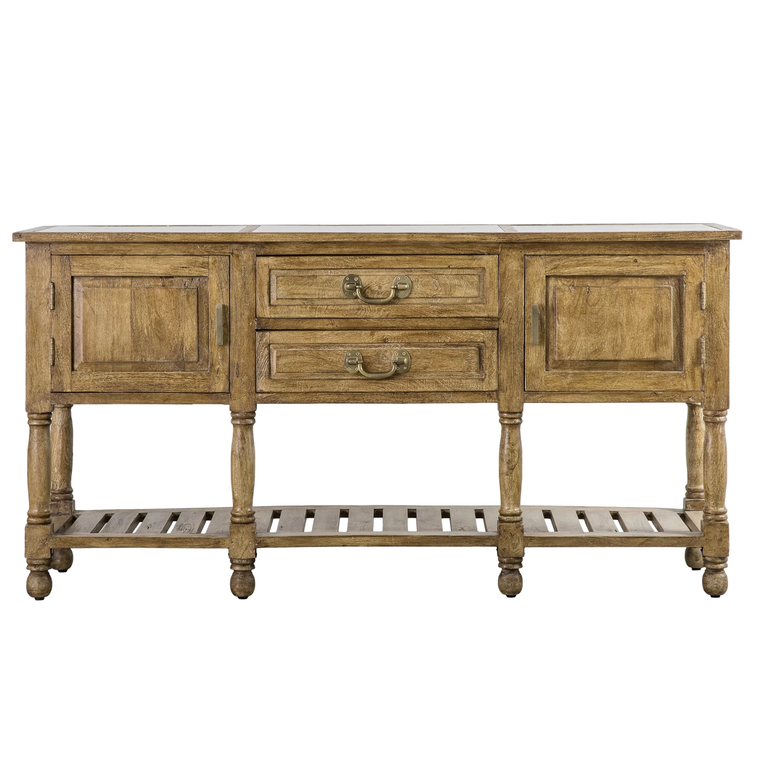 The top is inset with three pieces of marble, and the wooden base features two drawers, two cupboards and a low slatted shelf.