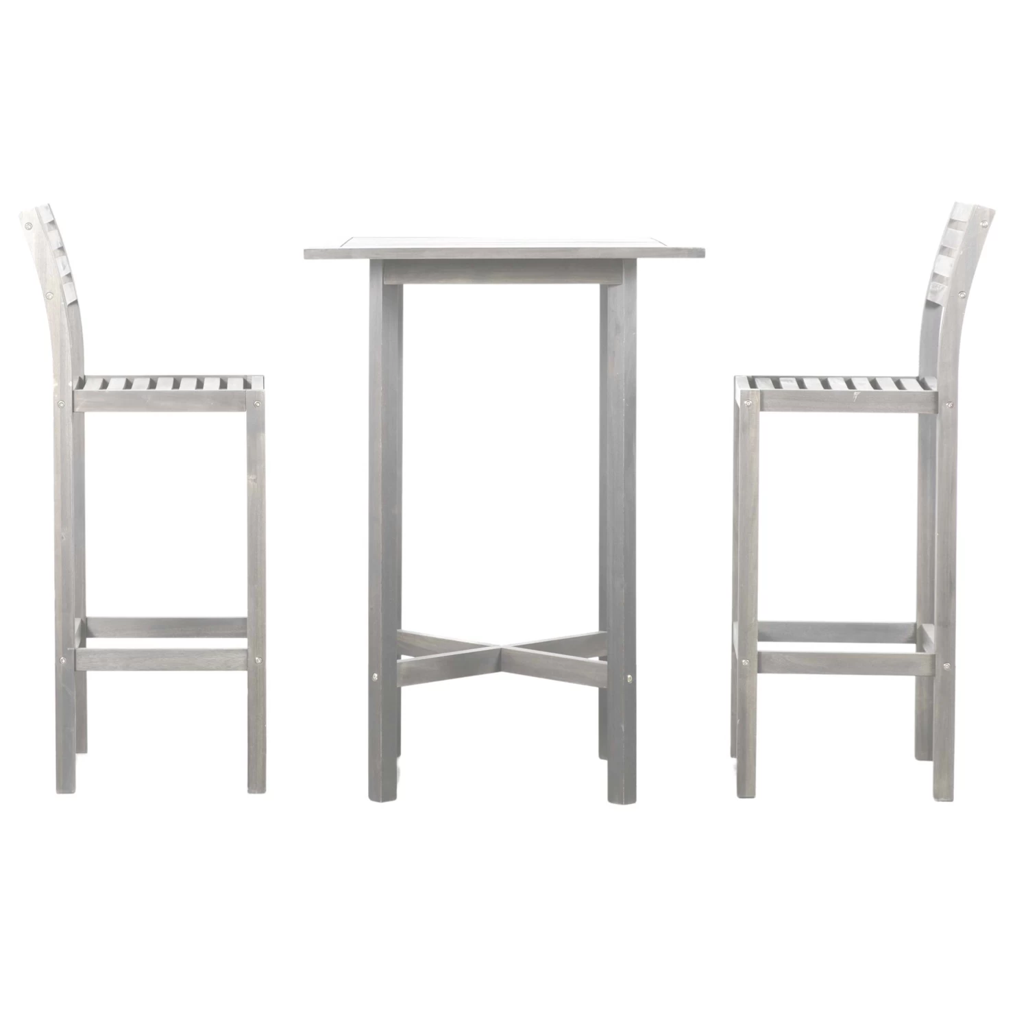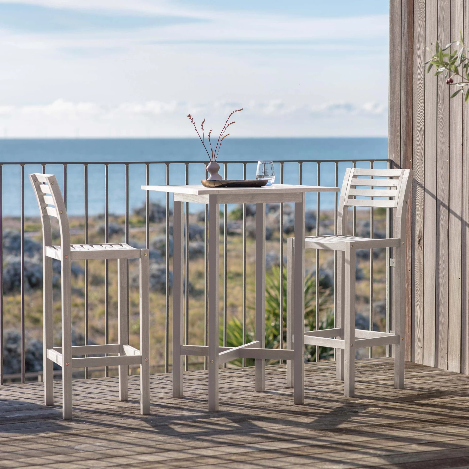 The high bar table and two chairs have been made from Acacia wood and is available in either a painted whitewash finish or a painted black finish.