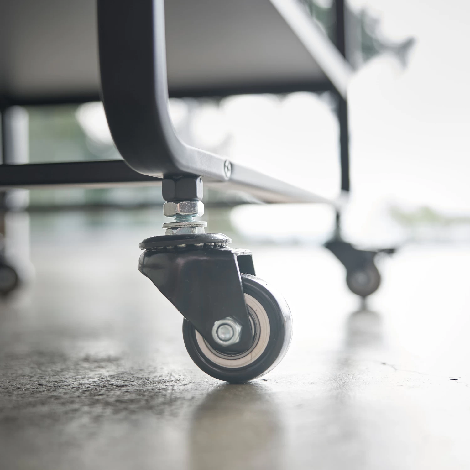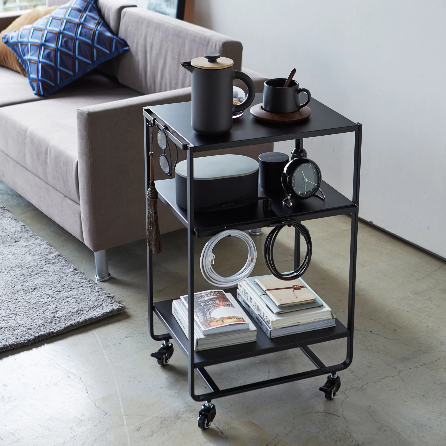 Crafted from black steel, this handy wagon has a handle on the top shelf and castors at the bottom.