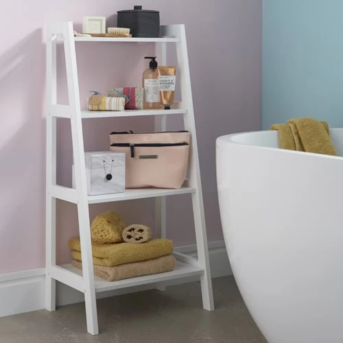 Freshen-up your bathroom with our new white eggshell ladder-shelf storage unit. A simple yet effective alternative to the usual bathroom storage units, this handy ladder-shelf has 4 shelves to store life’s daily clutter.