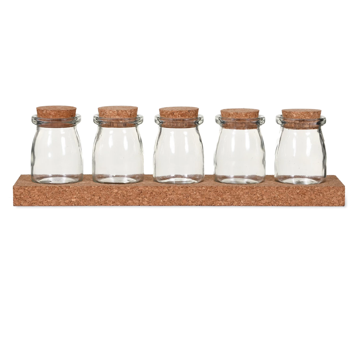 The cork base houses five lovely shaped glass spice jars with thick cork lids to keep the contents fresh.