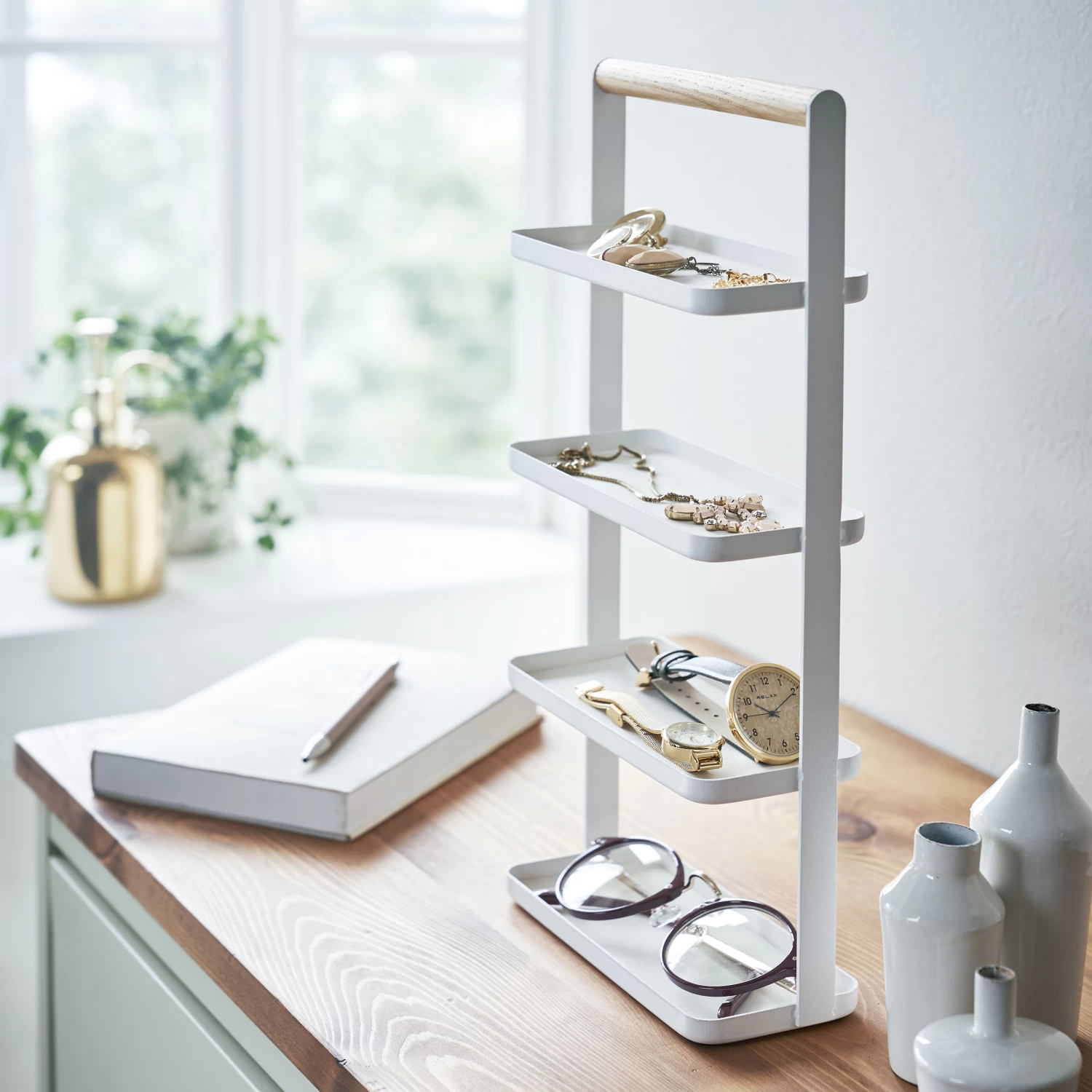 Our natural wood and white metal 4 tier storage stand is the perfect addition to any dressing table or bedside cabinet for storing jewellery, make-up, hair bobbles, watches, glasses etc.