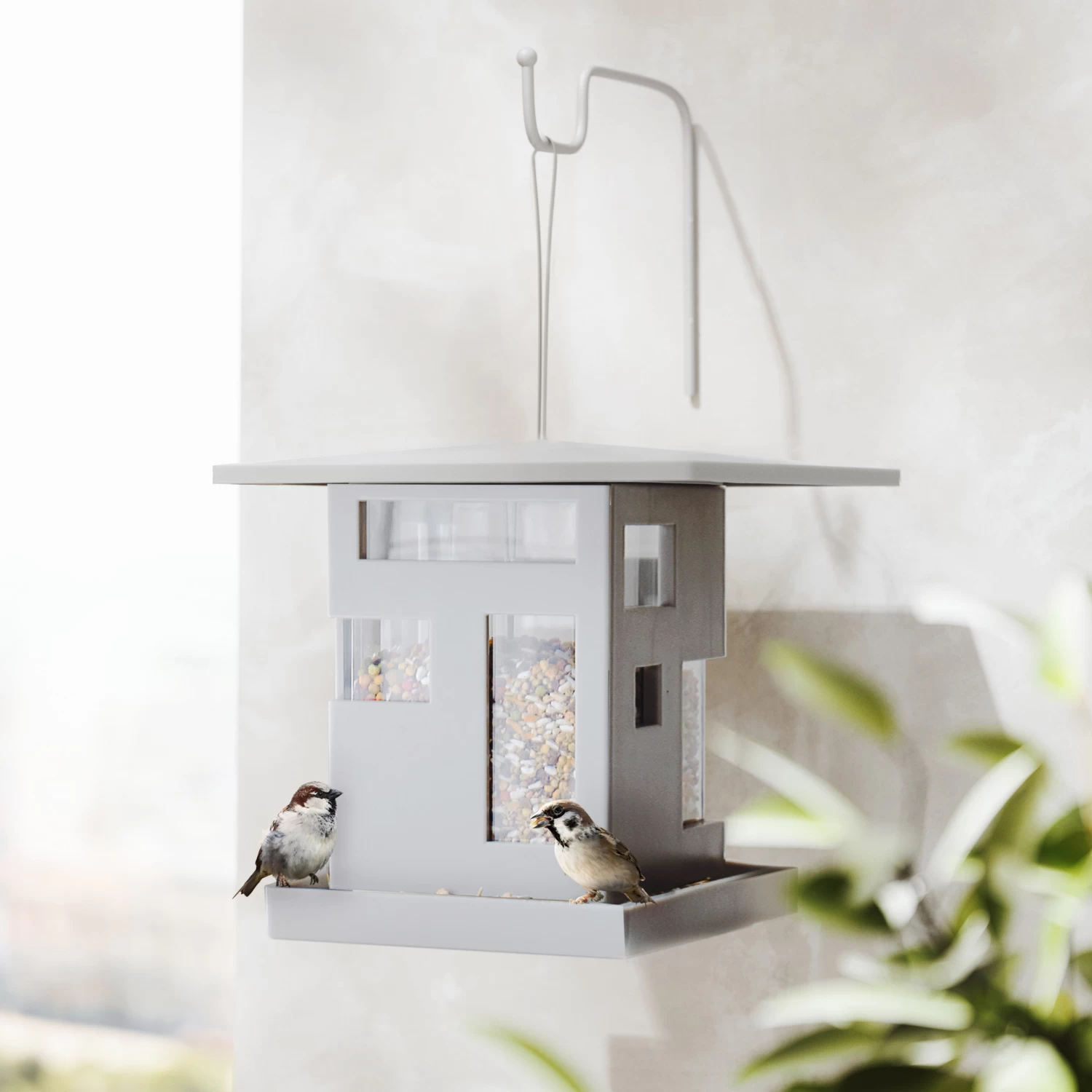 The Bird Cafe bird feeder from features a cube-shaped architectural form with asymmetrical windows.