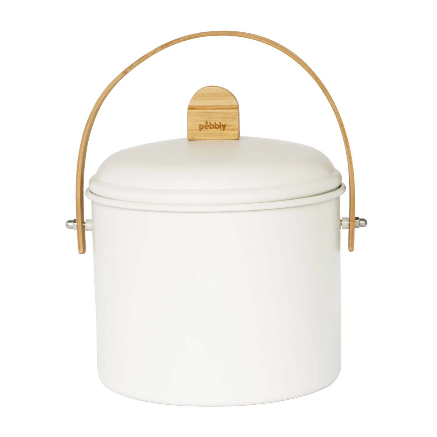The bucket is available in a clean cream colour, and the bamboo handle makes it easy to either empty the contents into a compost bin or a larger waste bin.
