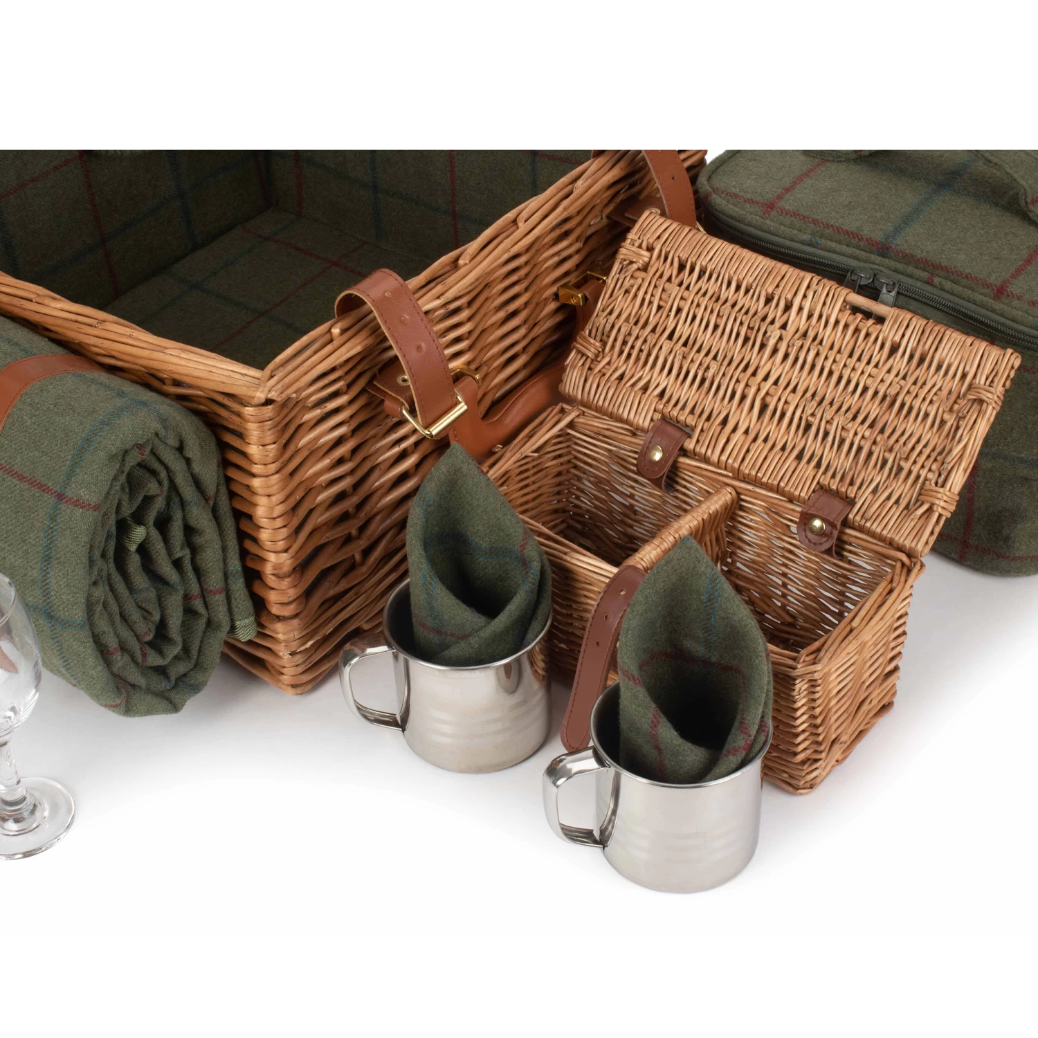 The hamper comes complete with 2 stainless steel knives, forks, spoons, acrylic wine glasses, ceramic plates, mugs and napkins. It also includes a bottle opener, salt and pepper shakers, a stainless steel flask, a cooler bag and a green tweed picnic blanket.