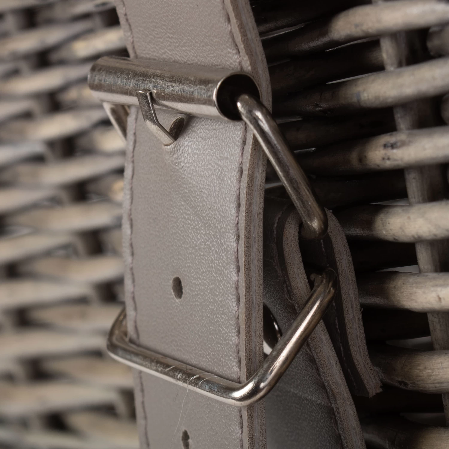 The chest can be securely closed using the two grey faux leather fastening straps.