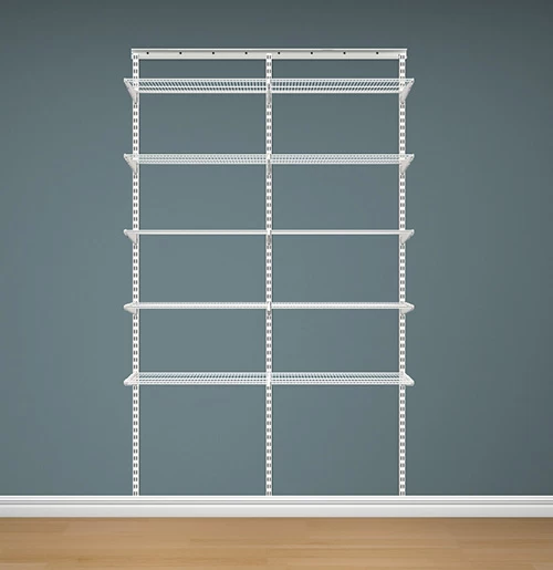 Shelving Starter Kit 3 in classic elfa white offers 600cm of storage over 5 x 120cm wide x 30cm deep ventilated shelves.