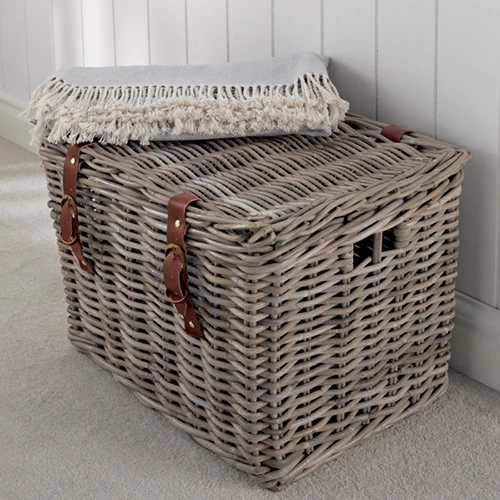 This large lidded basket comes complete with lid and distressed leather hasps to complete that country look.