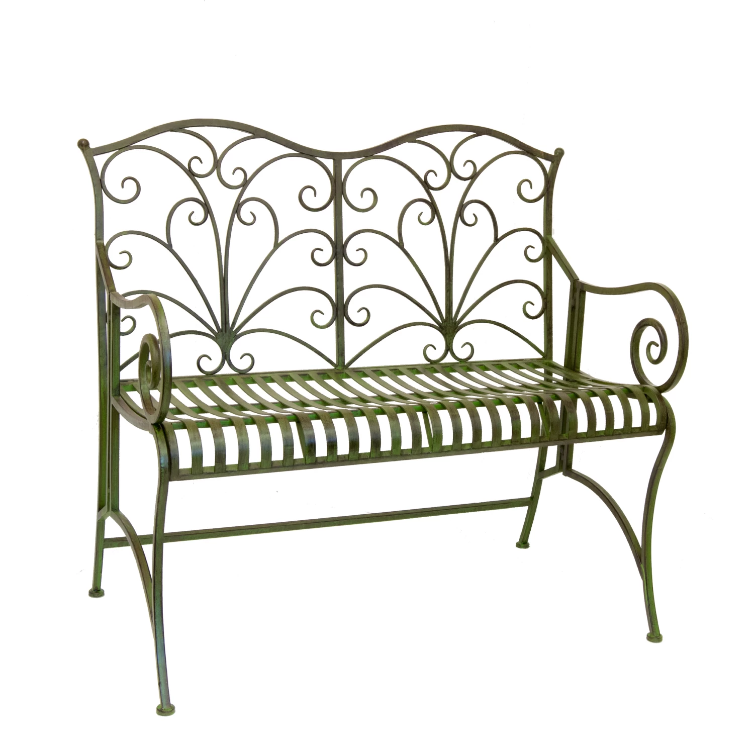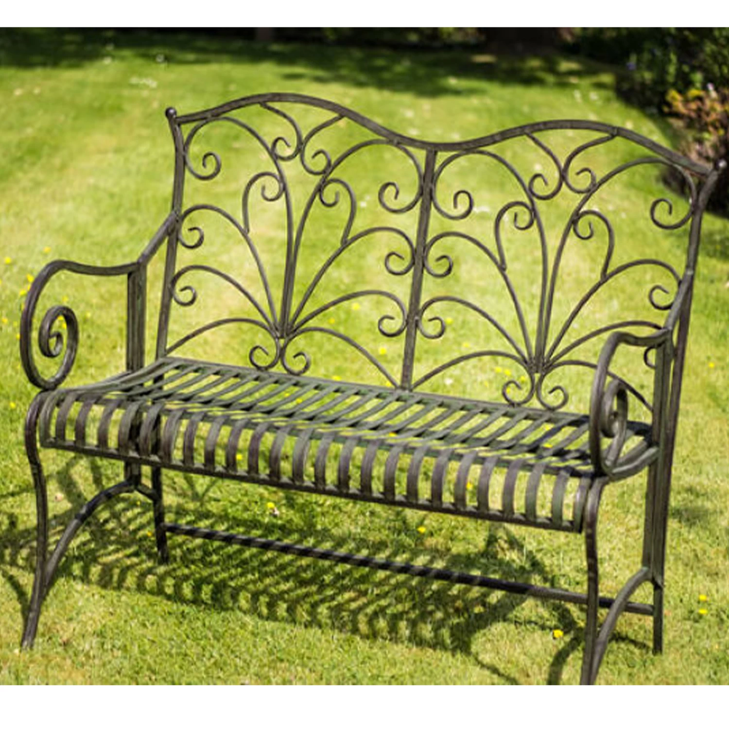 Our green powder-coated steel Lucton bench can comfortably seat 2 people and has been designed for use either in the garden or a conservatory.