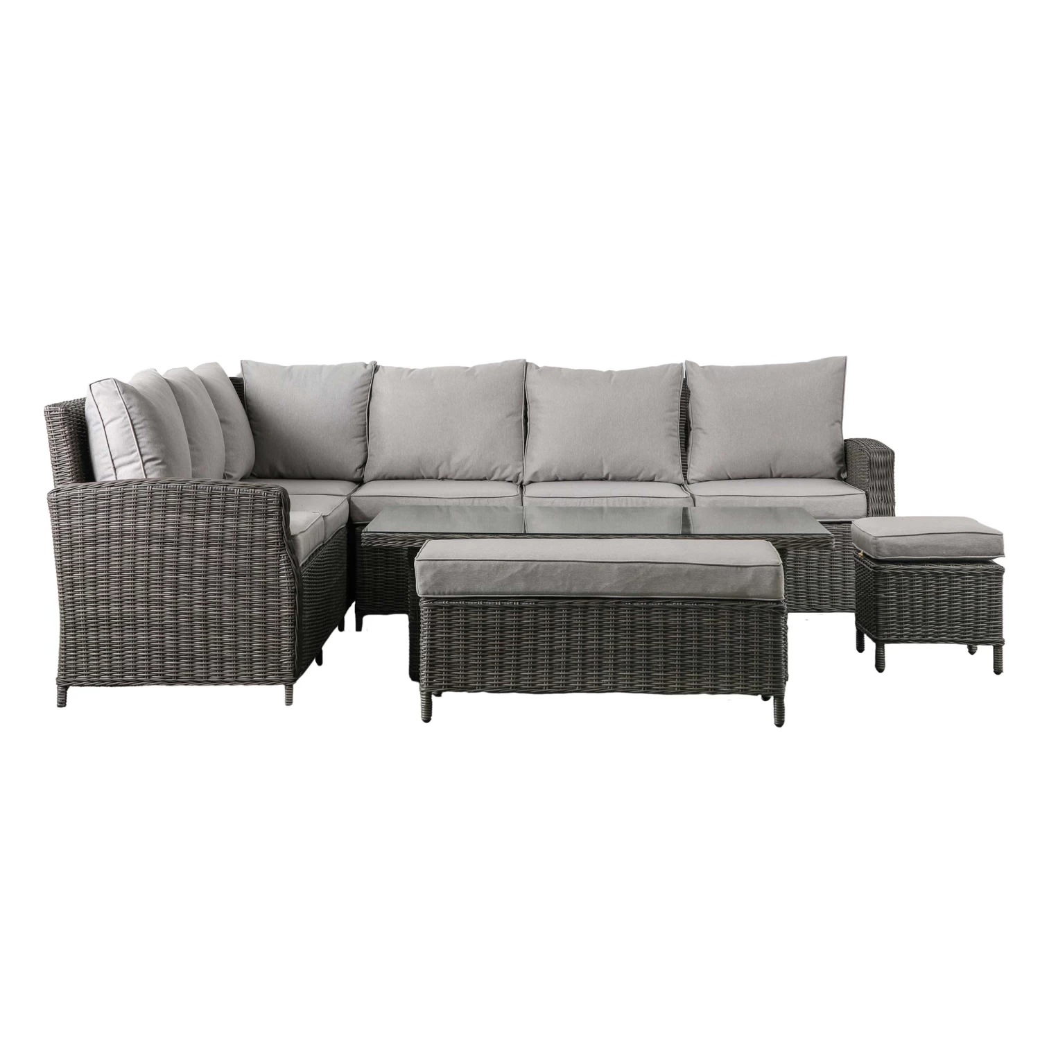 This complete garden furniture set includes a large corner sofa, an ottoman, a stool and a rectangular riser table.