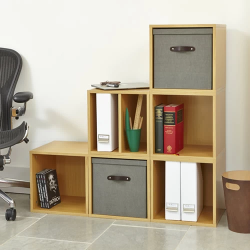 Our set of 6 wooden modular storage cubes for the home office are available in either a white or oak finish and come complete with 2 grey lidded boxes inside to really swallow the office clutter.