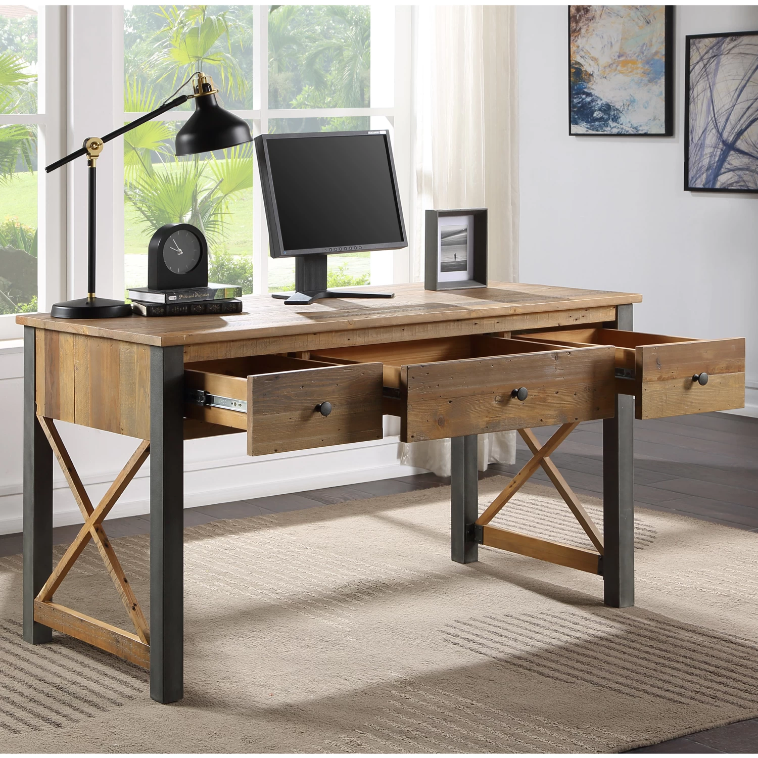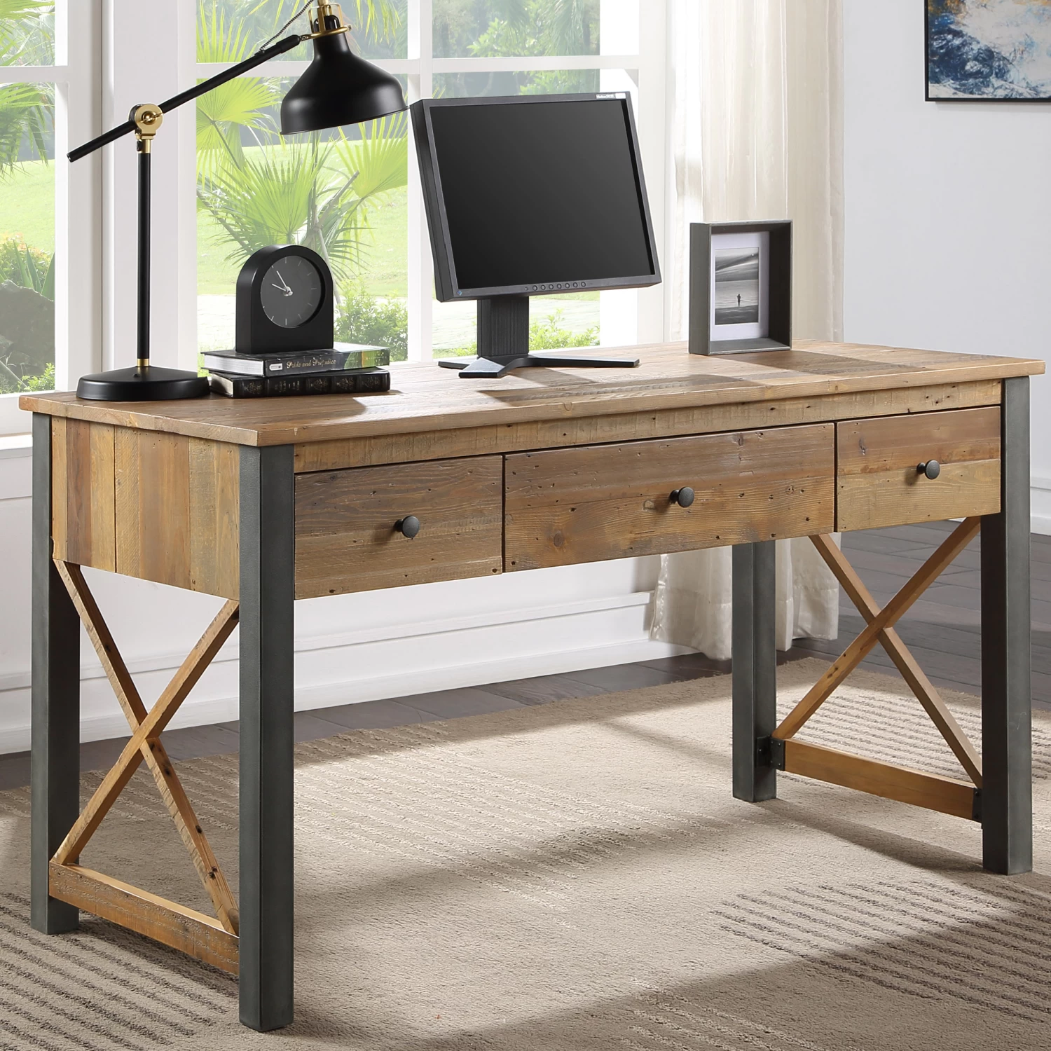 There are 3 roomy drawers and the desk features a stylish cross design in the frame. The unit is finished with a resilient satin lacquer which is hard-wearing but also emphasises the beautiful colour and character of the timber. The distressed, powder-coated steel frame ensures an attractive matt finish, which combines beautifully with the solid reclaimed rough sawn wood