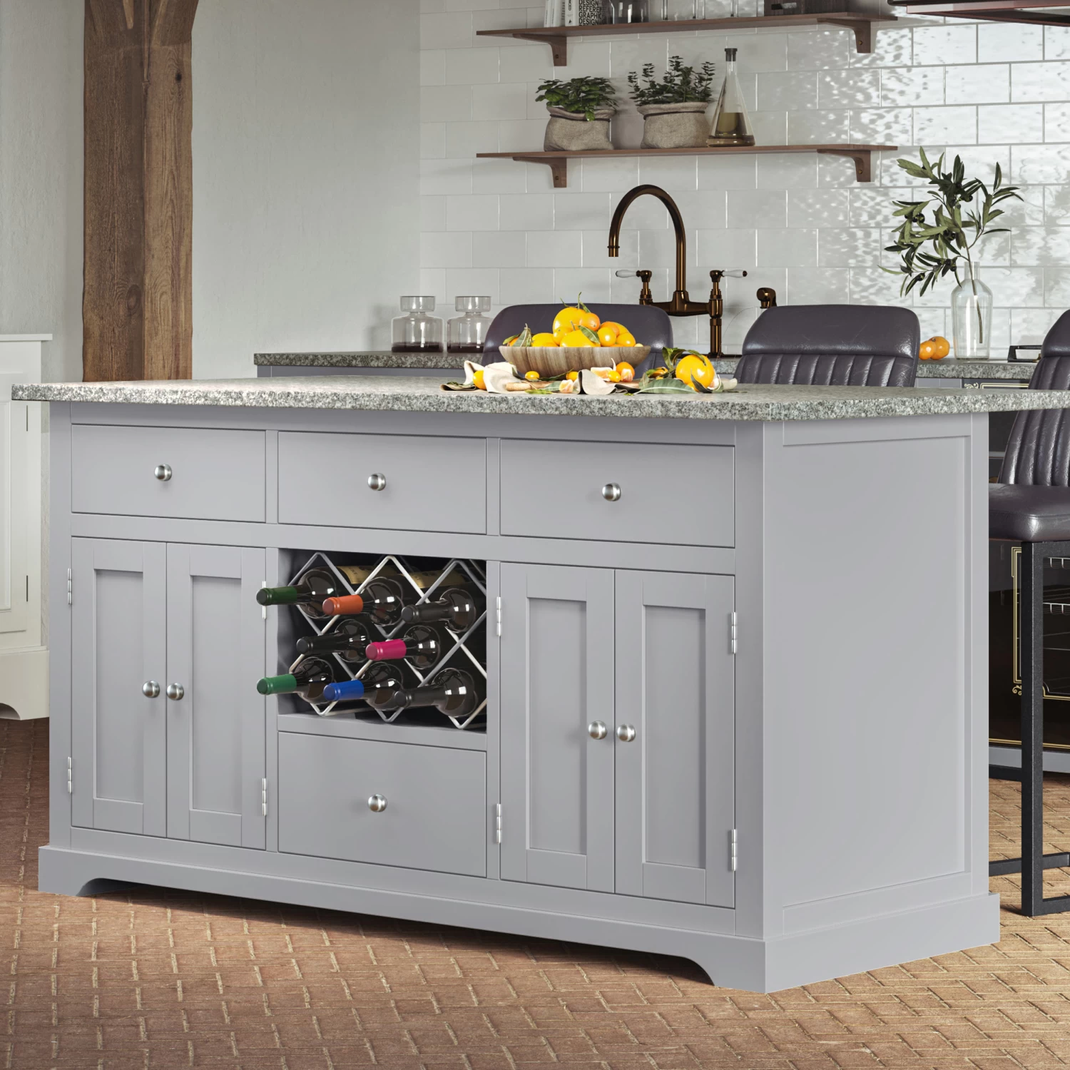 Ideal for storage, food preparation or a central point for socialising, our kitchen island is made from wood with a grey painted finish and is available with a choice of 3 tops.