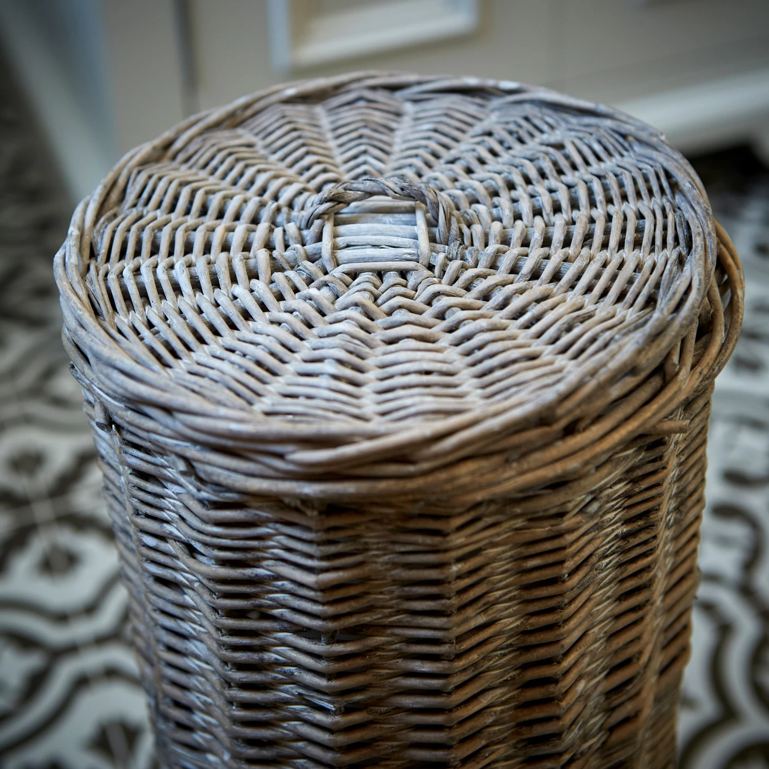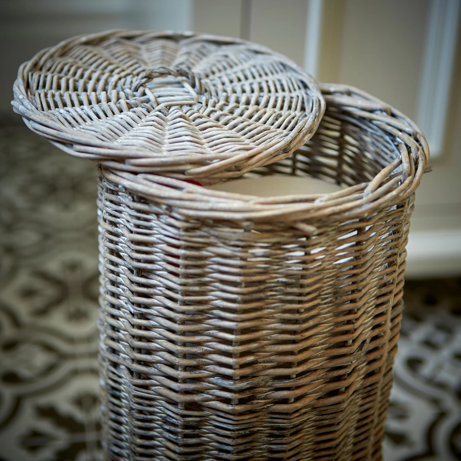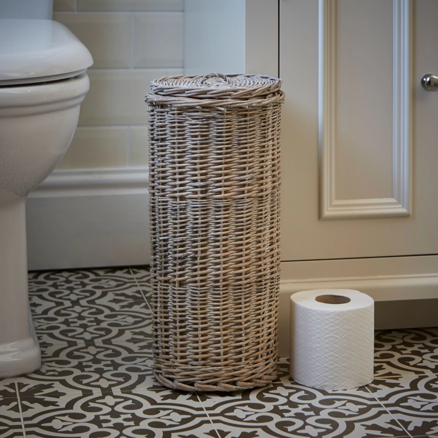 This neat cylindrical lidded wicker basket has been designed to store away up to 3 spare loo rolls.