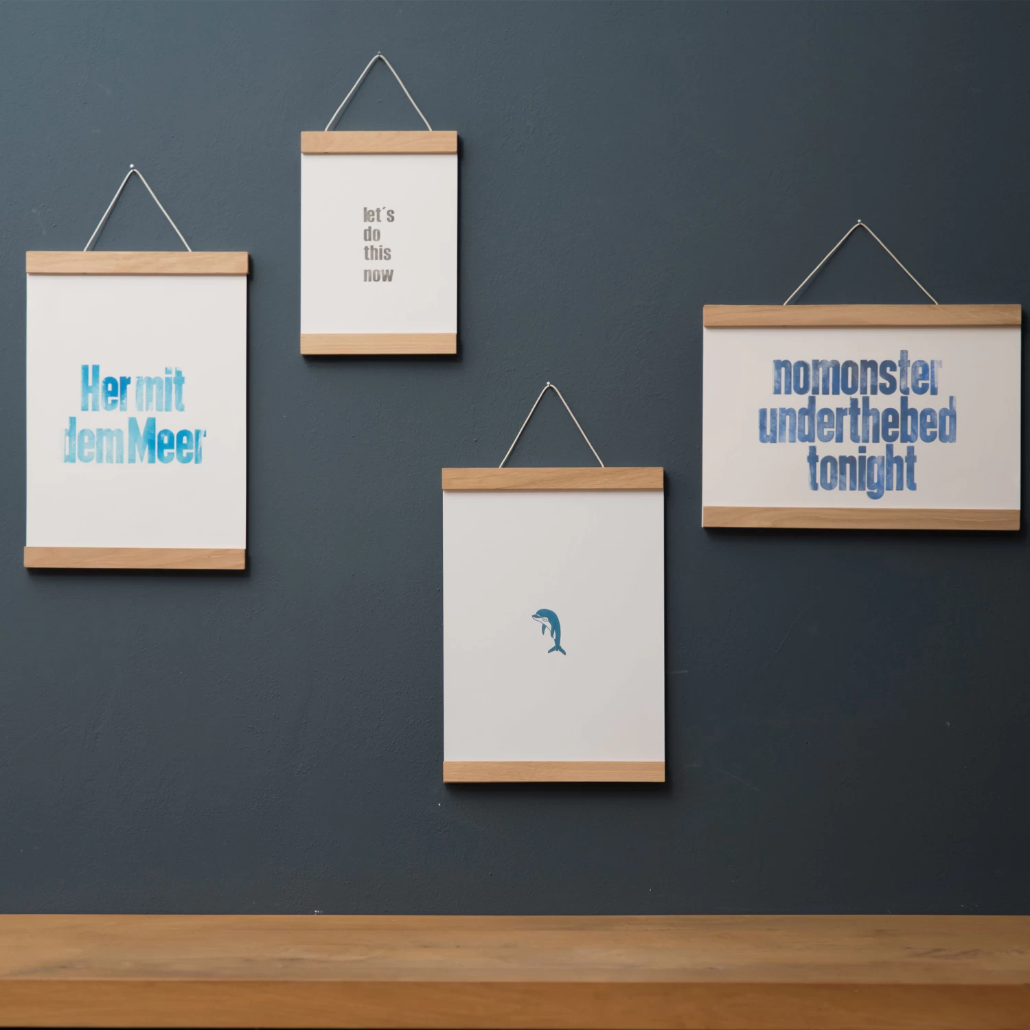 The two wooden strips have been crafted from oak and contain a magnet to keep the contents in place. This also allows you to quickly and easily swap your prints around.