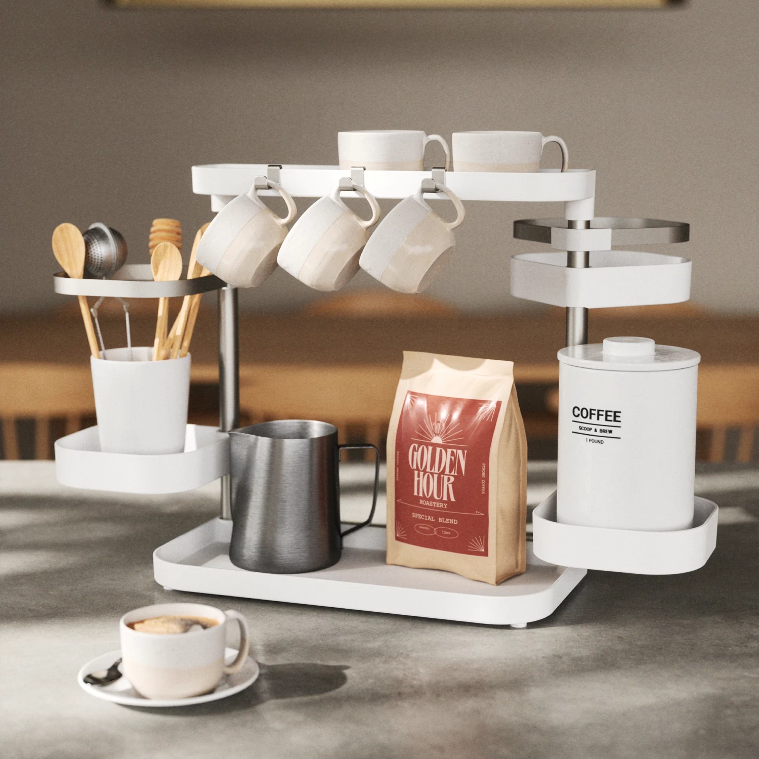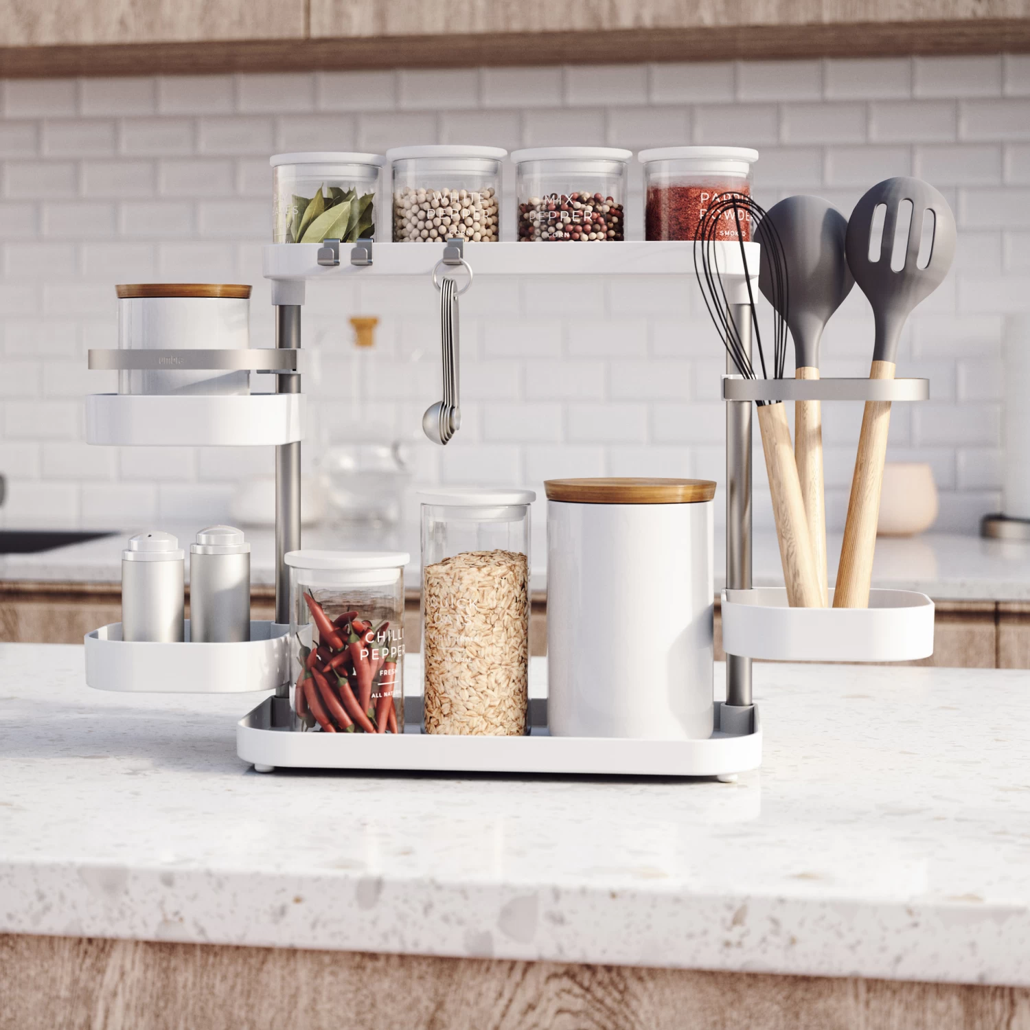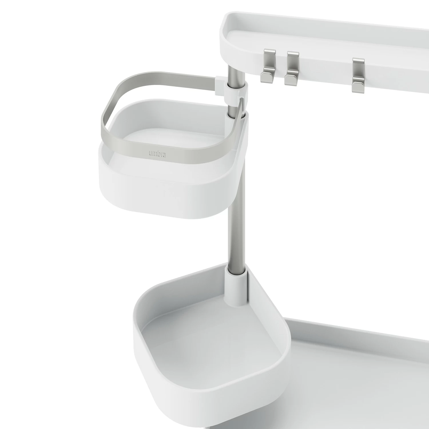 Whether used in the kitchen, bathroom or office, Holster features 5 different trays, 2 hooks and 2 clips for a variety of items.