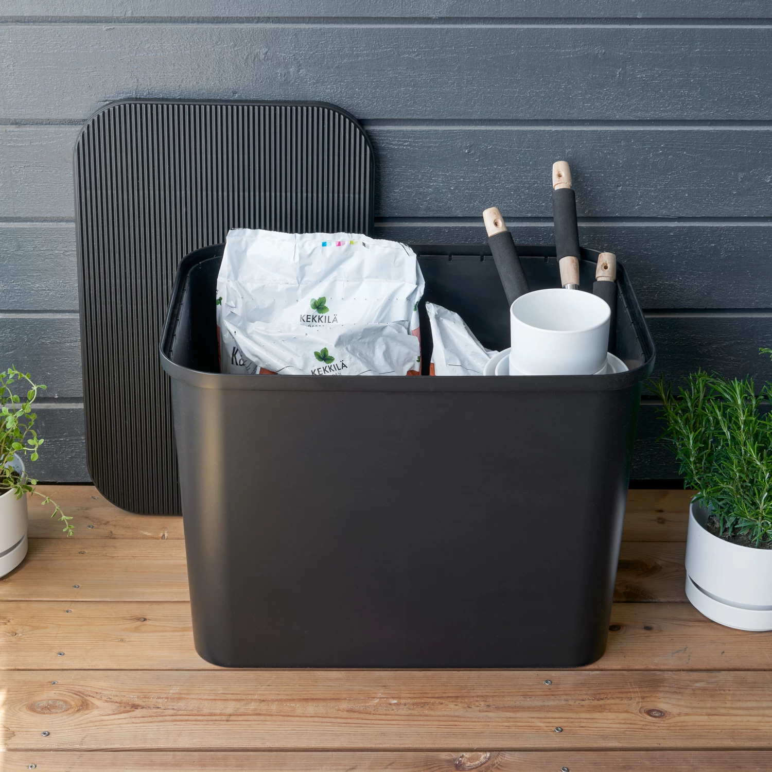 The black plastic lid protects the contents from water, moisture, dirt etc allowing it to be used on a balcony, terrace, patio etc.