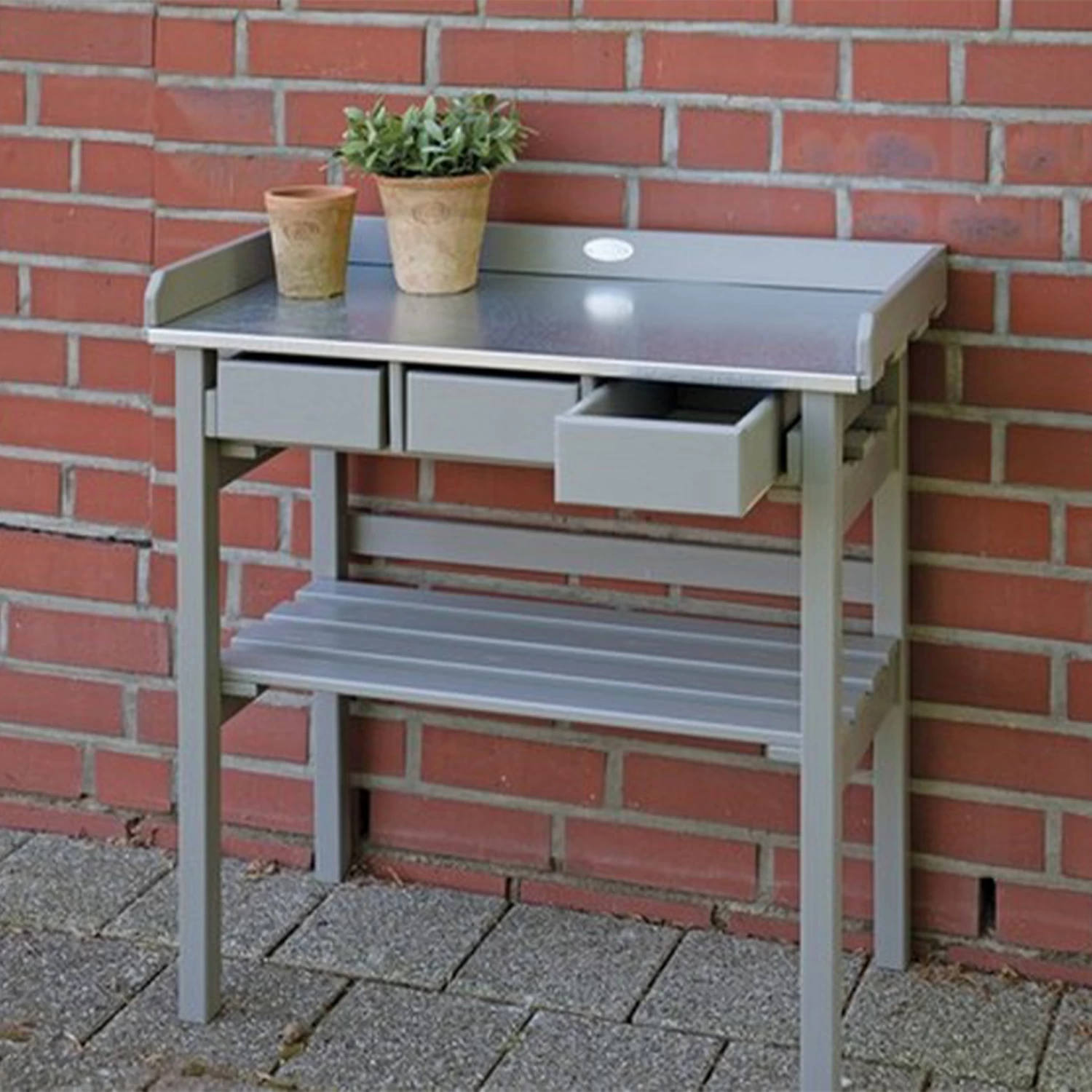 The unit has a spacious shelf which is great for storing your empty pots, bags of soil, etc. and the three drawers are handy for storing your seeds, string and scissors to hand.