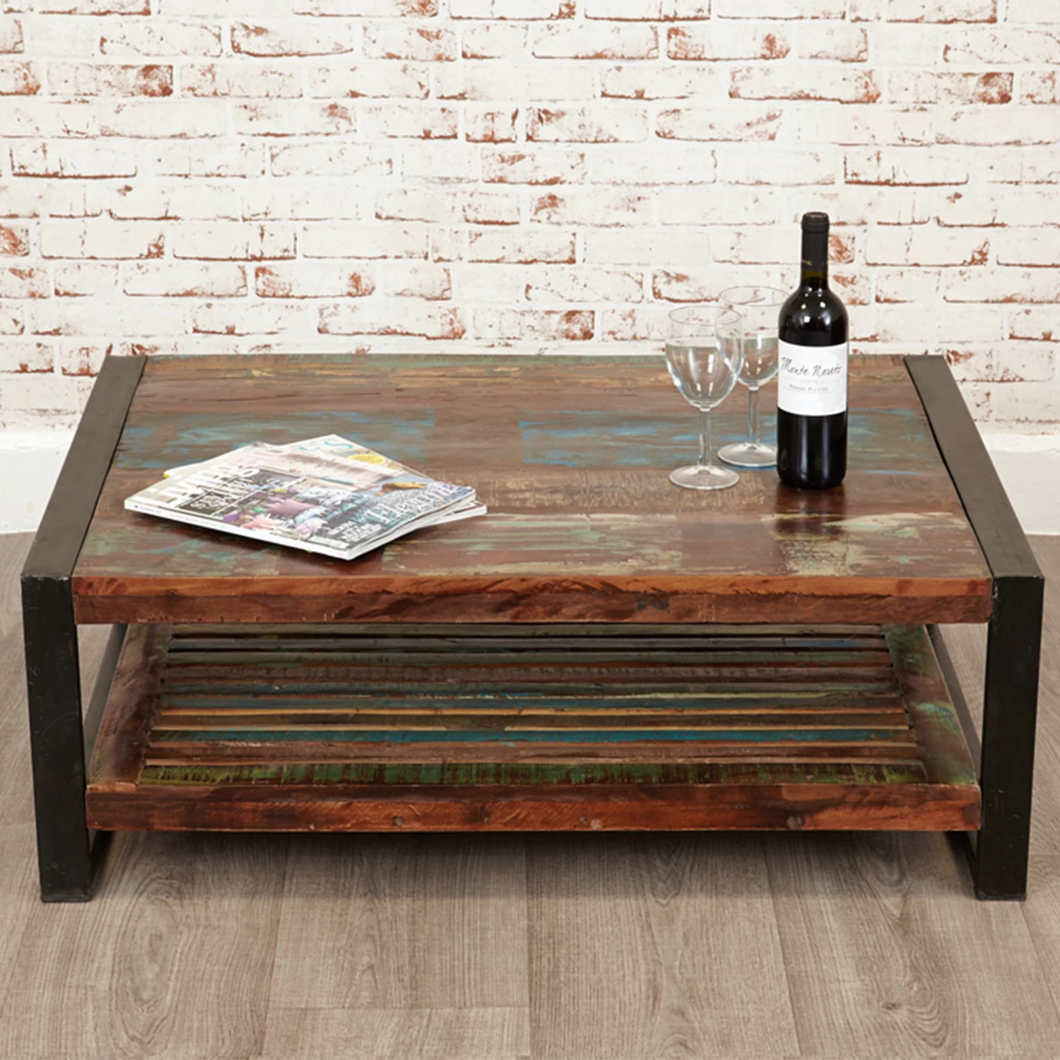 Crafted using a blend of reclaimed woods, the rectangular coffee tables adds a colourful, modern twist to compliment its high quality, vintage materials and features an underside shelf for storing coffee table books, magazines and newspapers.