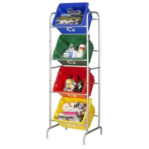 The recycling rack comes with 4 x colour coded 32-litre recycling storage boxes, one for glass, one for metal, plastics and paper etc.