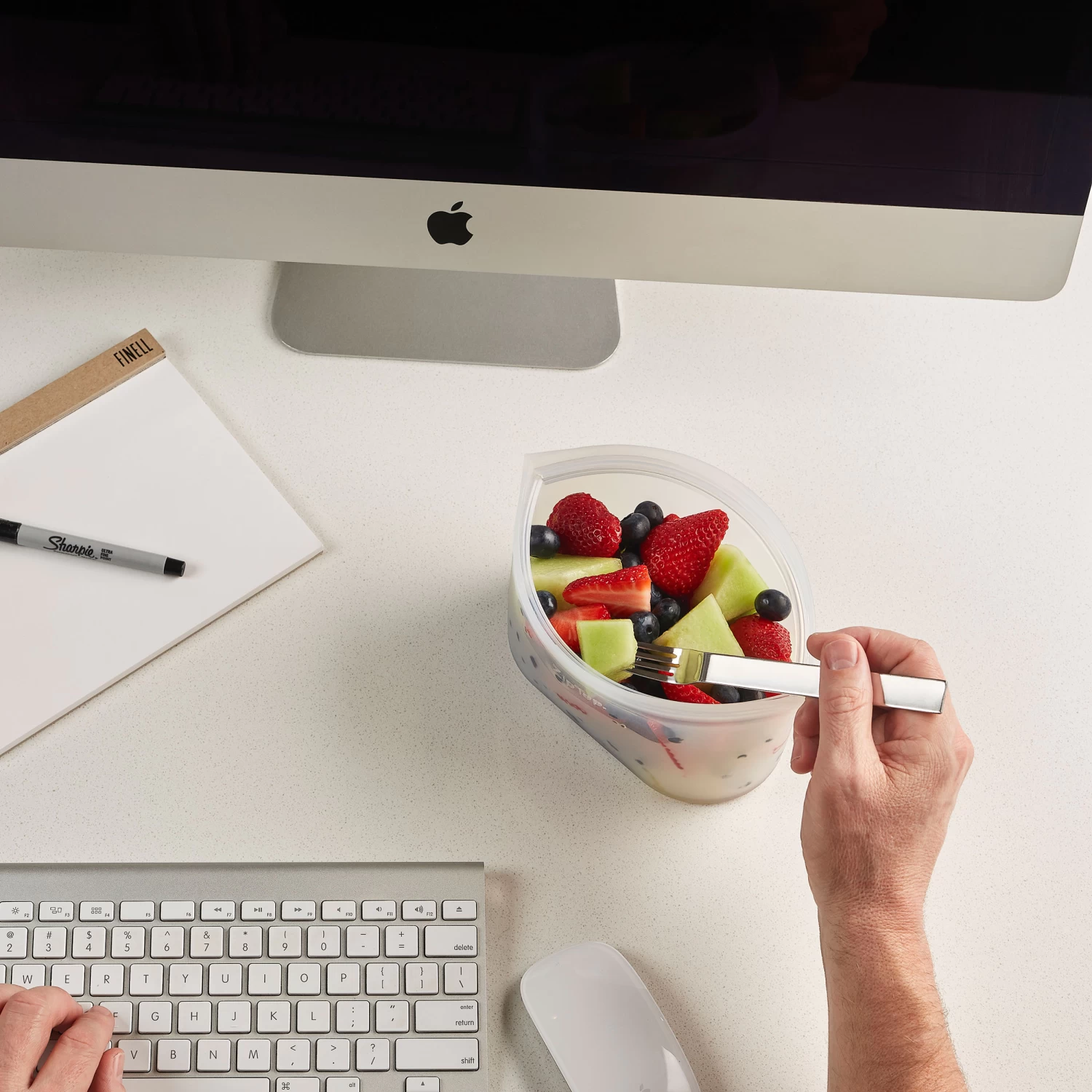 Designed with a flat base, this sturdy bag stays open and can stand unsupported, making it a breeze to fill. It also enables it to double as bowl when eating at a desk or on the move.