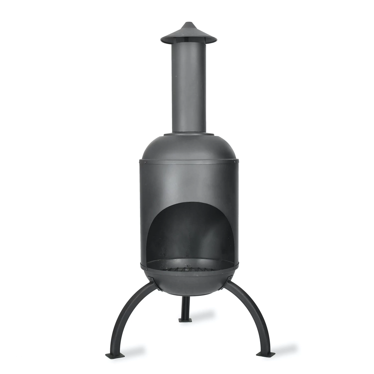There’s a grill inside the opening to set the wood on, raising it from the ashes. The chimney draws the smoke out and away from your seating area.