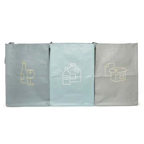 Set of 3 colour-coded recycling bags for glass, plastic and paper. The bags are clearly picture labelled up so you know what goes in which bag.