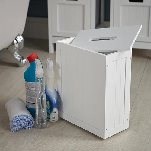 Clear the bathroom clutter with our white lidded Shaker Style storage unit which is ideal for the discreet storage of loo cleaners, air-fresheners and other cleaning products and cloths.