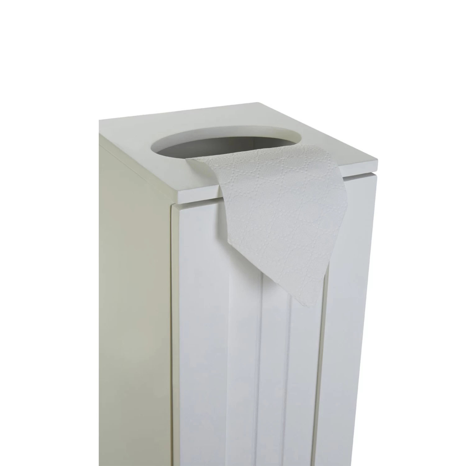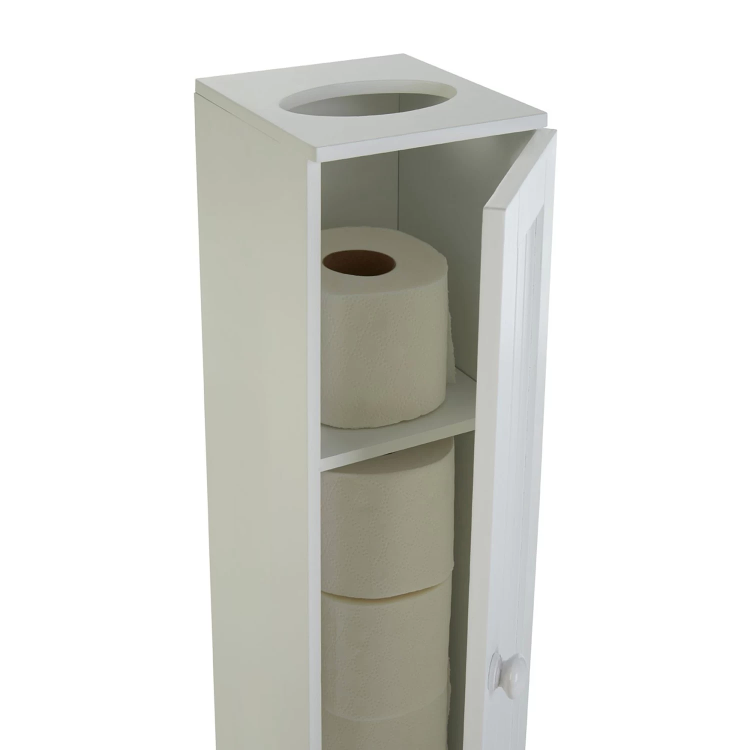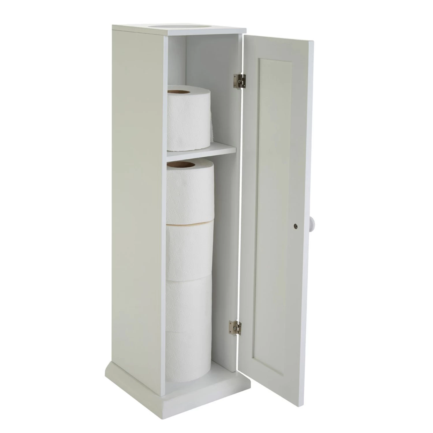 Our classic shaker-style white wood loo roll store and dispenser has shelf space at the top to dispense and a cupboard below to tidy away up to 4 extra loo rolls.