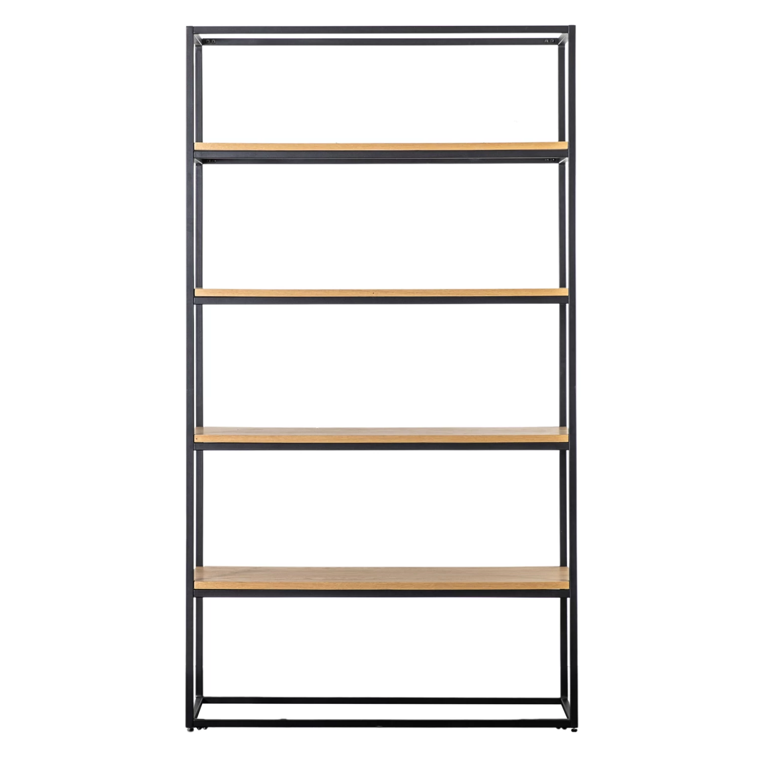 The unit combines clean sharp lines with 4 natural oak veneer shelves and a matt black metal base.