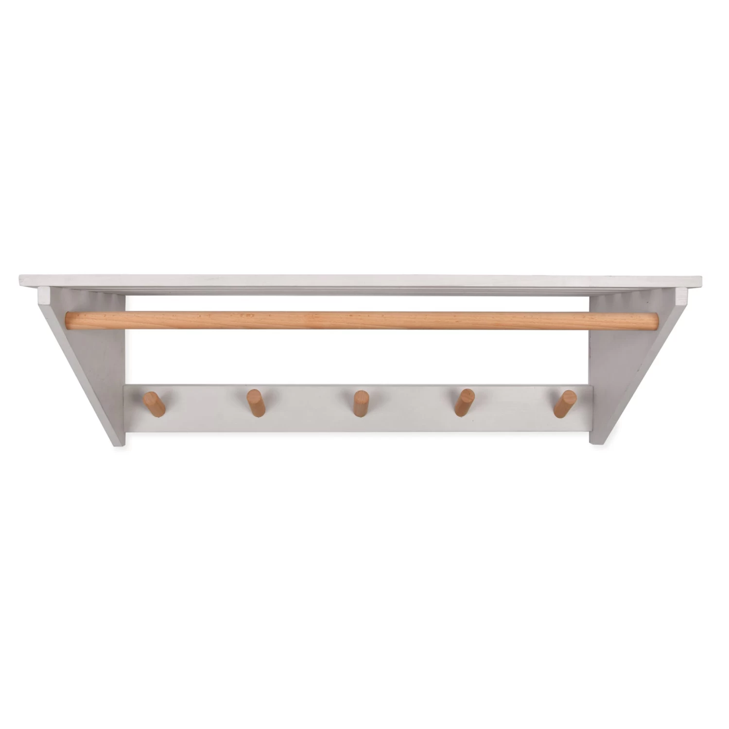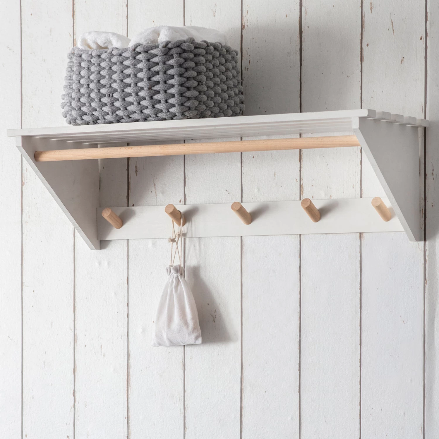 Crafted from beech and pinewood with a white finish, this wall-mounted unit has a slatted shelf, dowel rail and 5 hooks. The shelf is the ideal place for popping fresh linen and towels, while the dowel rail and 5 pegs offer somewhere to store tea towels, freshly ironed clothes etc.