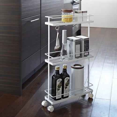At only 12cm wide, this mobile kitchen shelving unit will fit into the tightest of unused spaces and the handy castors make it easy to move when needed.