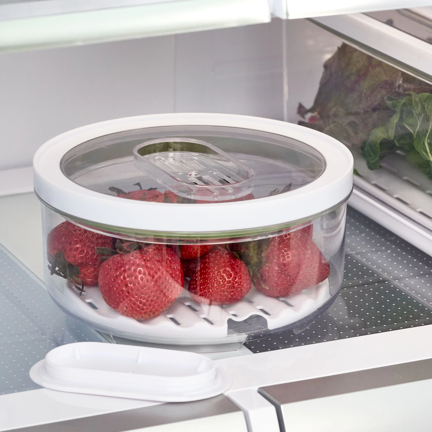 The airtight lid has an integrated vent and removable cover allowing you to adjust for lower humidity levels, while the removable drain tray insert can be filled with water for extra humidity. The tray also prevents your produce from bruising and provides some additional airflow keeping all of your stored produce fresh.