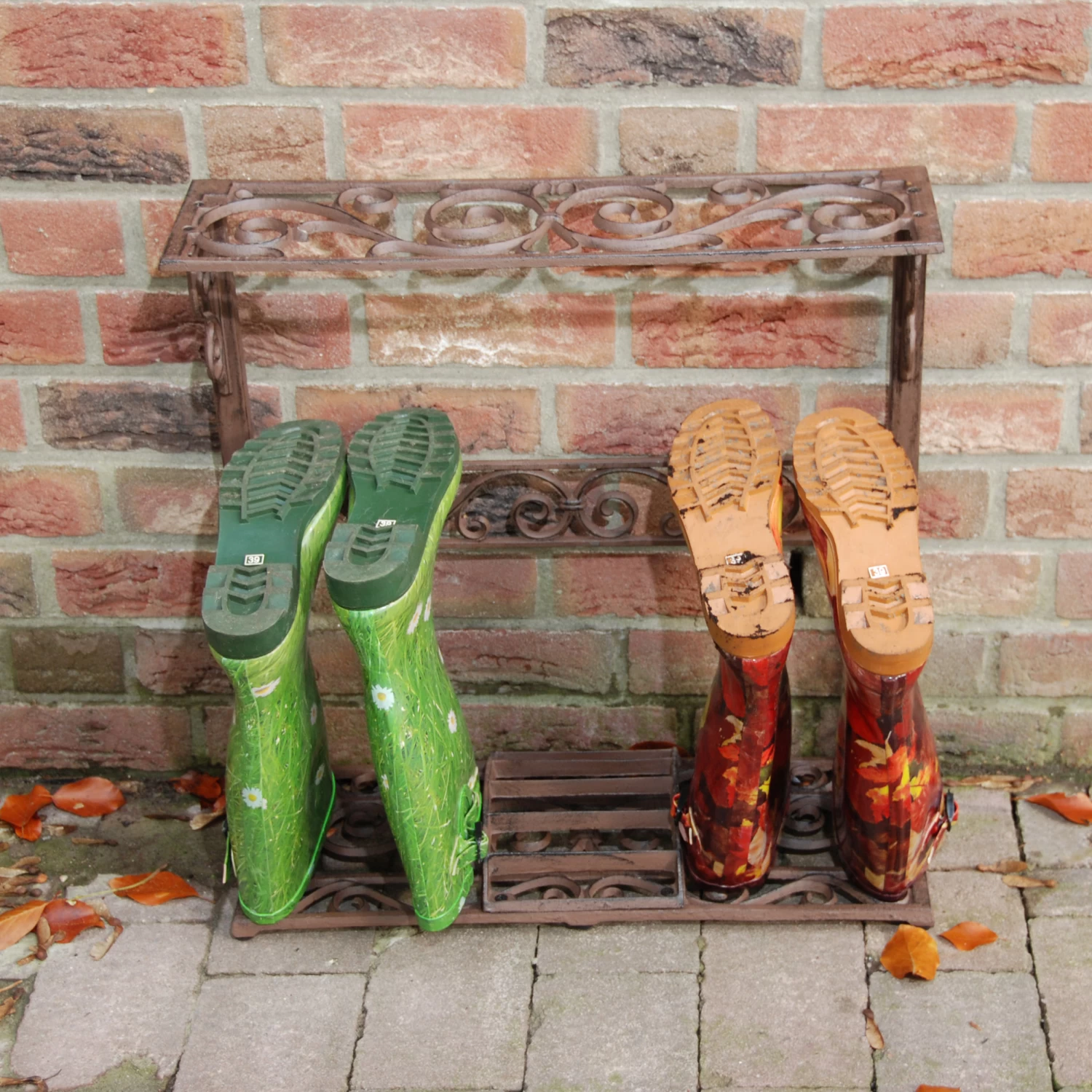 Perfect for storing a couple of pairs of muddy wellies or walking boots by the front or back door, this stylish wrought-iron welly store will stop muddy footprints being brought into the house.