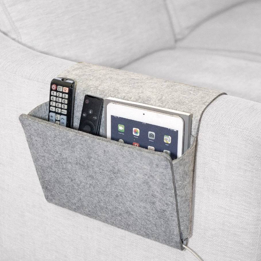 Our handy felt storage pocket has been designed to be neatly hung over arm of a couch.