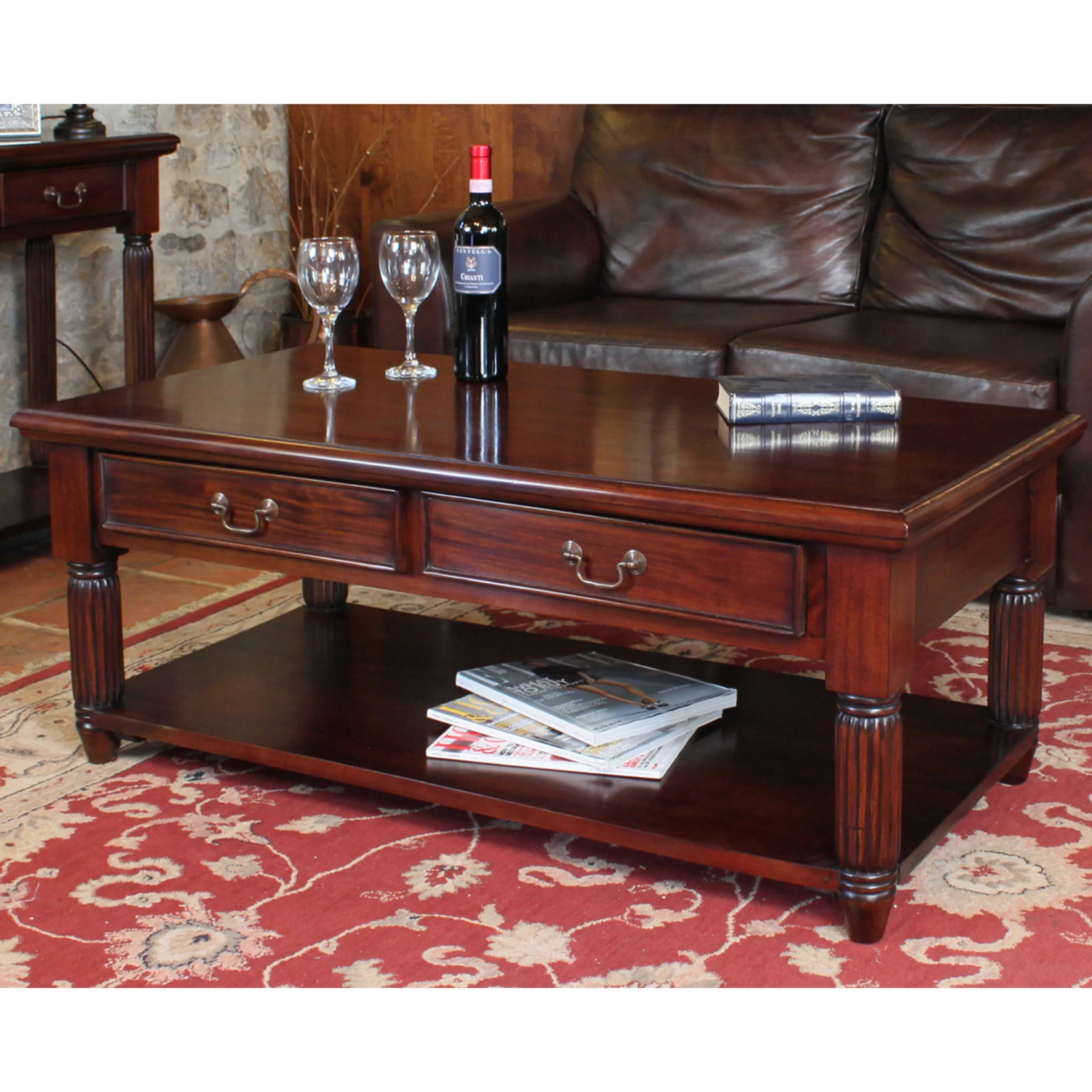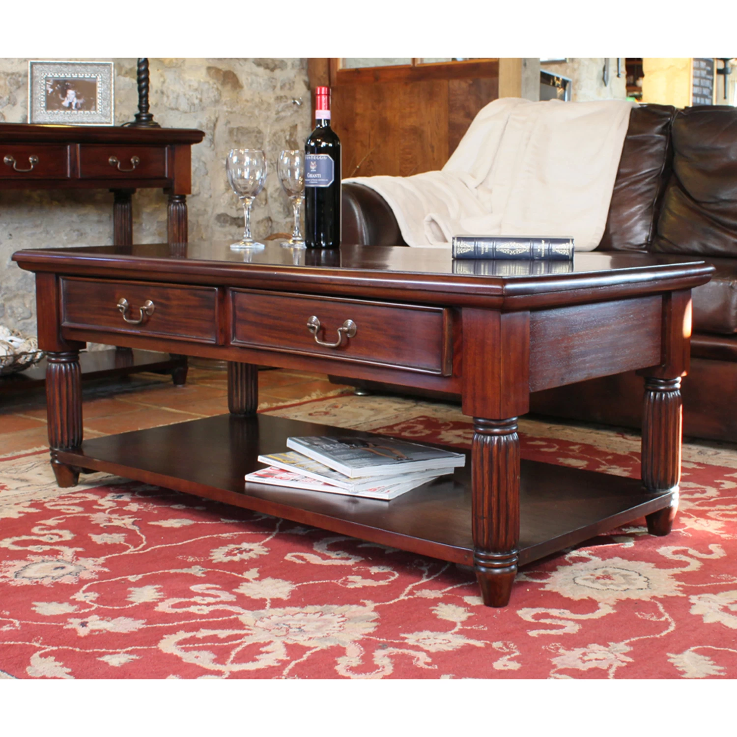 Our solid mahogany coffee table features two drawers and a shelf which are great at swallowing all that living room clutter whether it’s T.V remotes or magazines and newspapers.
