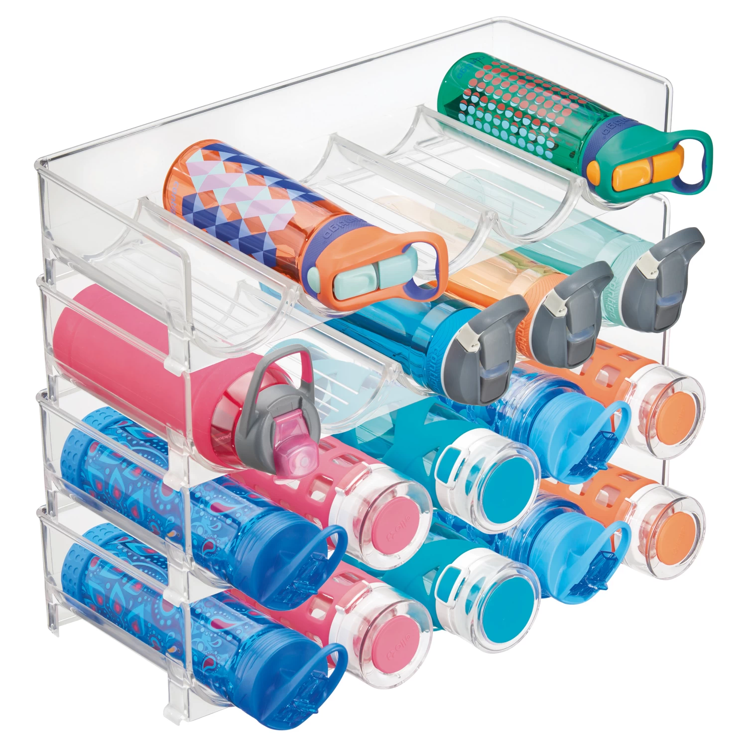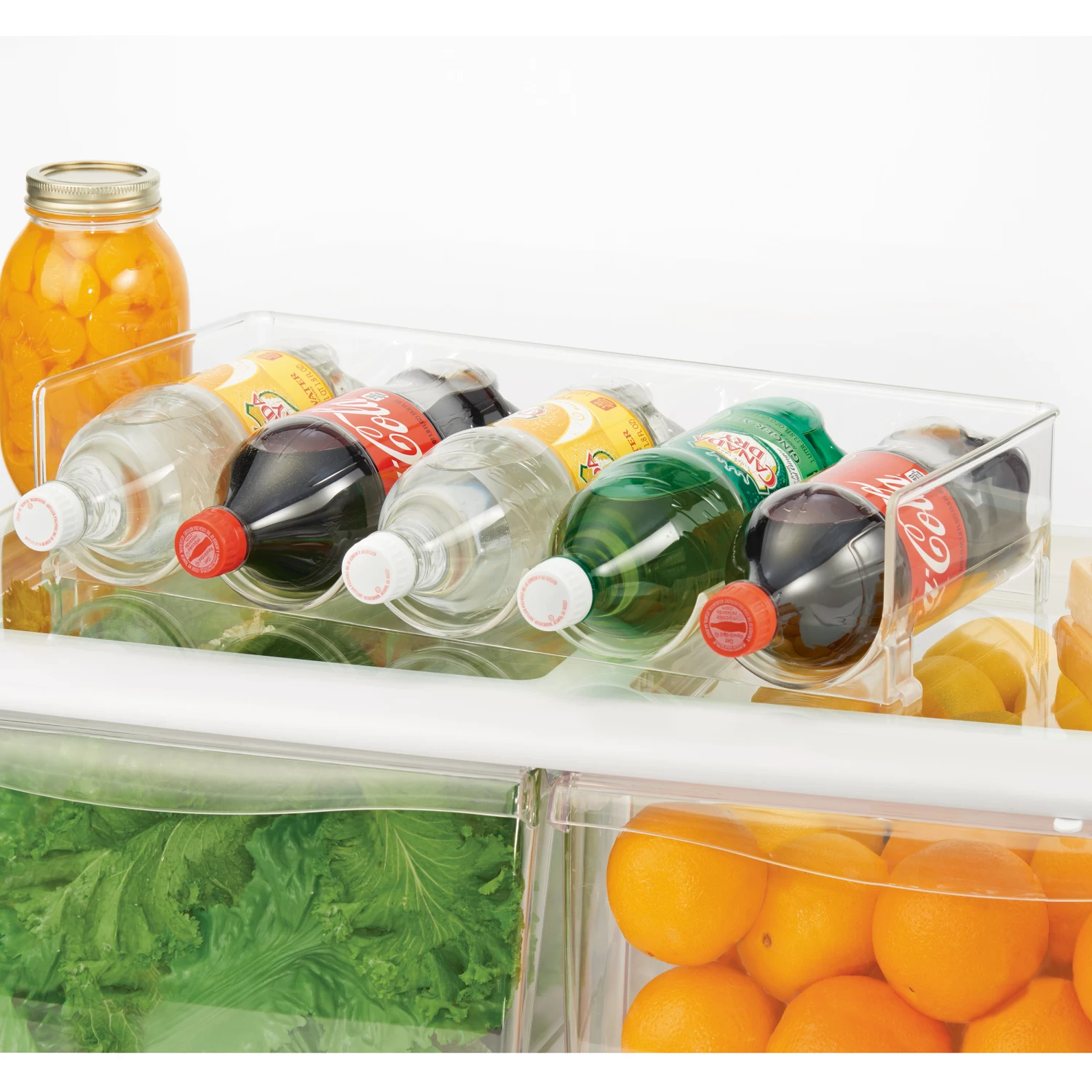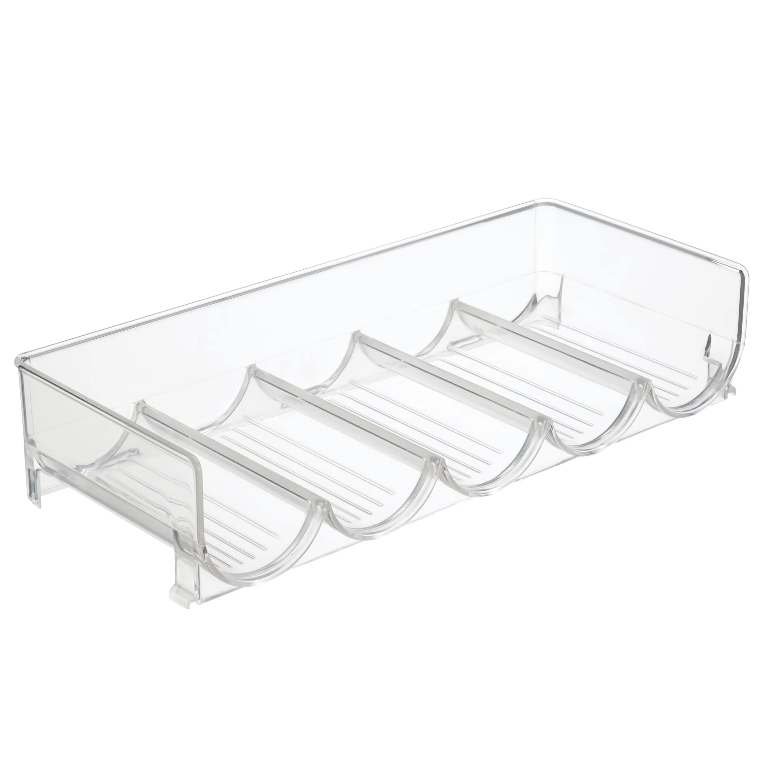 Clear plastic bottle rack suitable for storing 5 bottles of pop, wine, water etc.