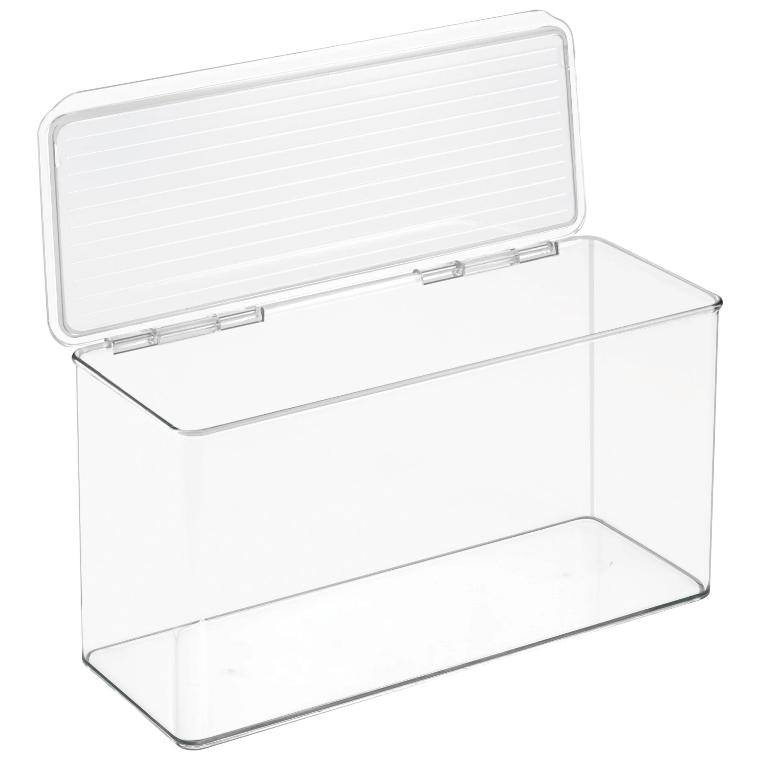 The hinged lid not only keeps the contents secure but also allows another box of the same width and depth to be stacked on top if multiples are purchased.