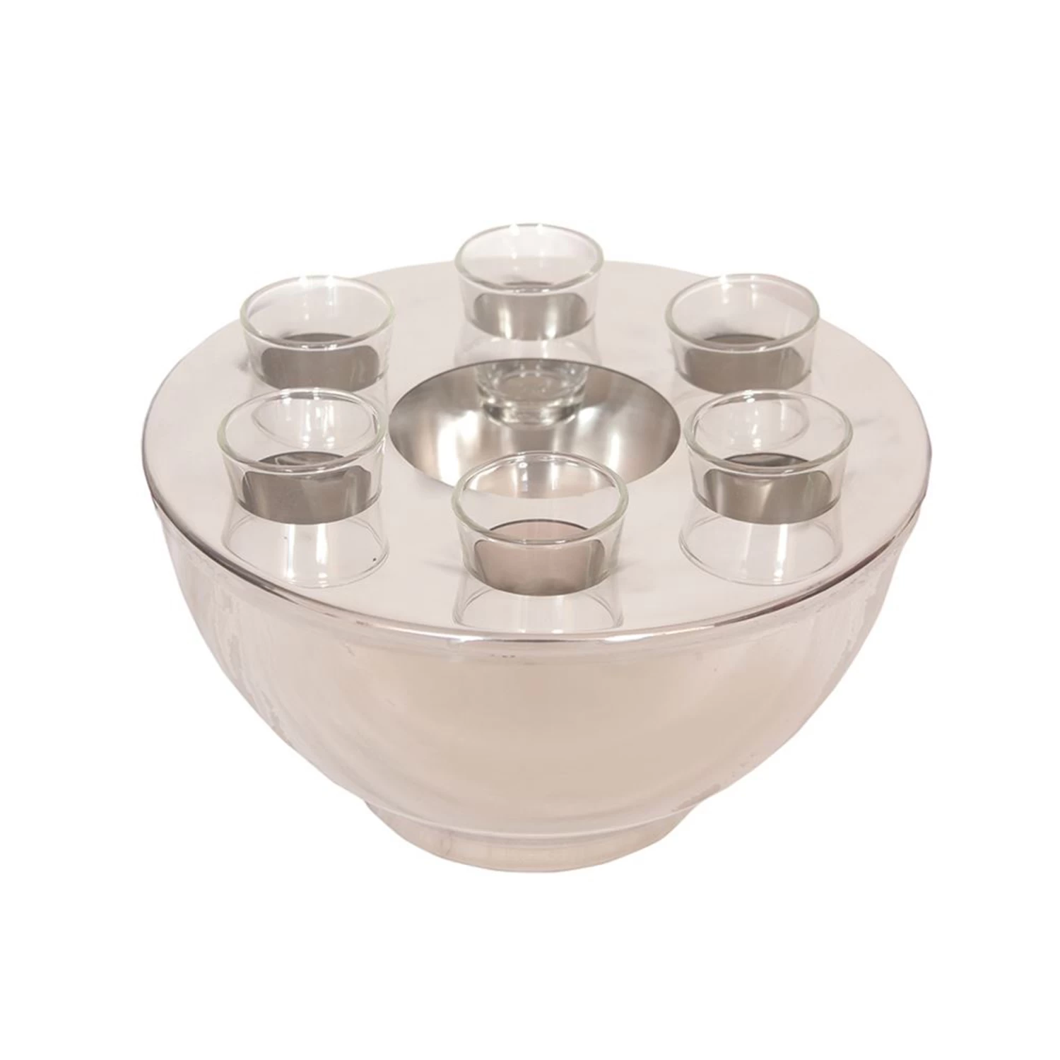 Your spirit of choice cools in the centre of the bowl whilst the 6 shot glasses eagerly await their use around the edges.