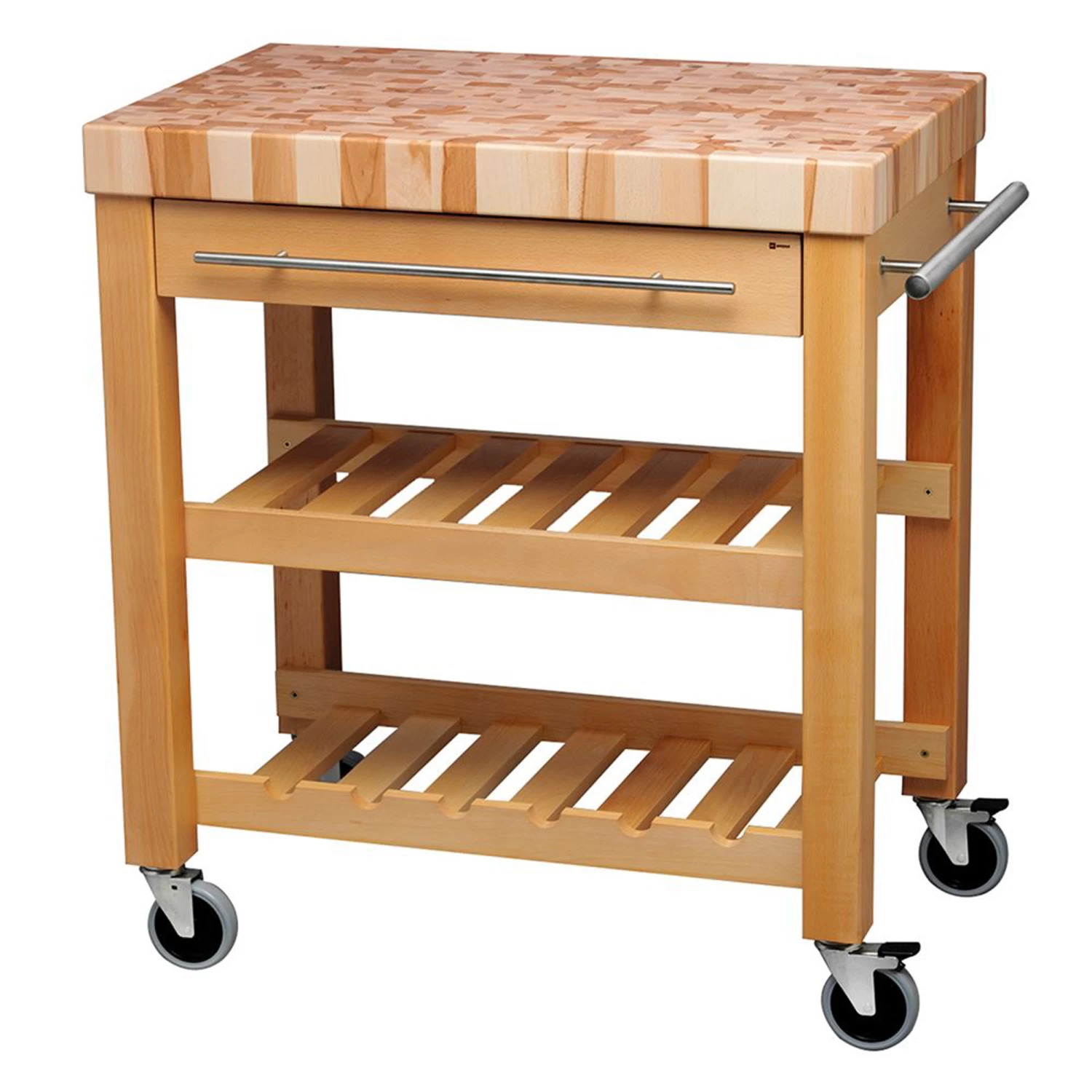 At 83cm wide, the Leverton features a 3″ thick solid beech wood butchers block, a spacious storage drawer and two slatted full-width shelves, one of which has six wine bottle neck supports to use as a wine rack to store your vino.