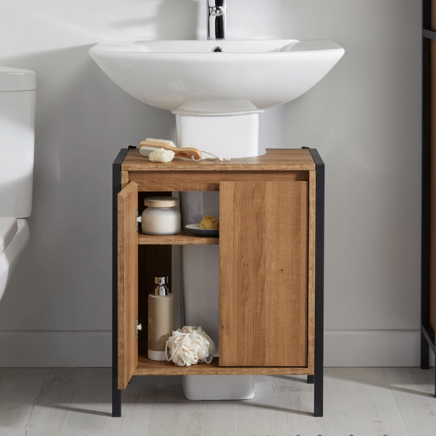 The wood grain effect and black metal detailing will look great in any bathroom or en-suite.