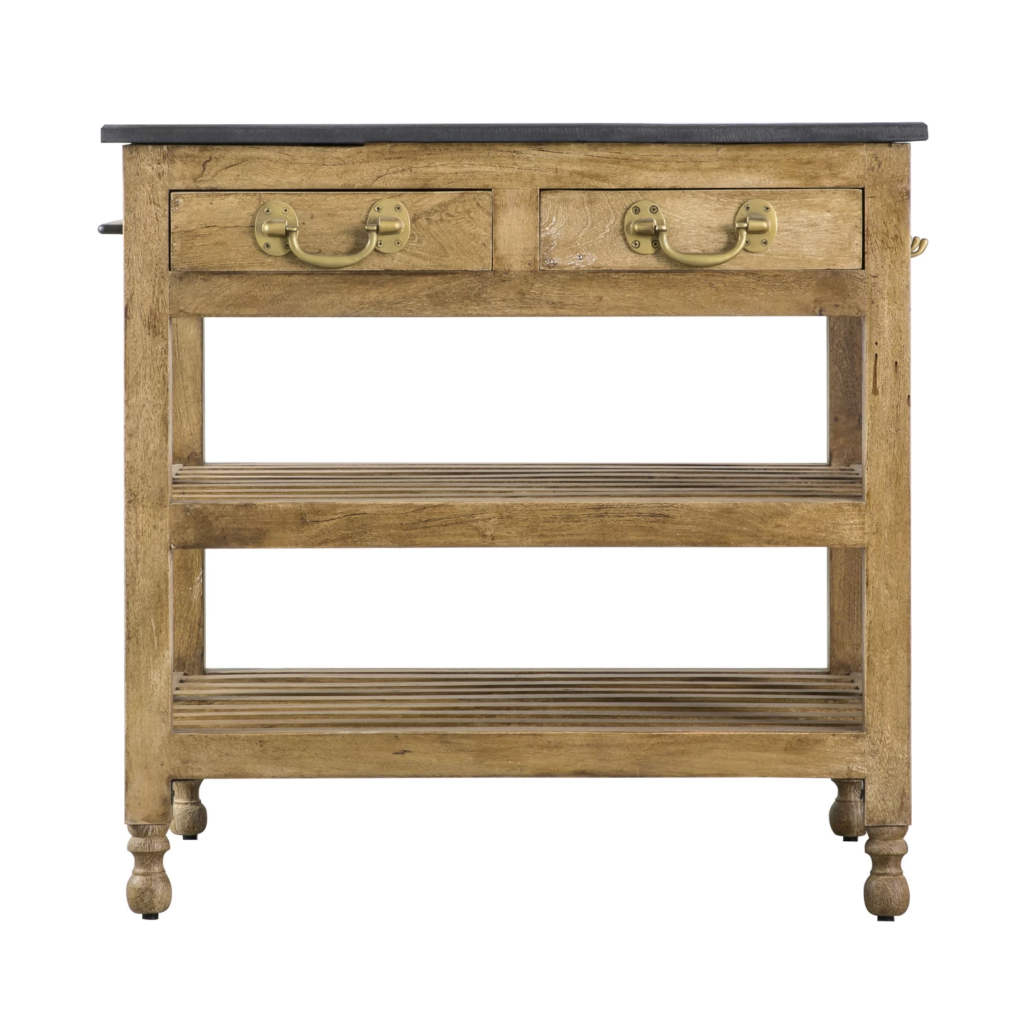 The natural stone top compliments the Mango wood base beautifully. There’s plenty of storage space thanks to the two slatted shelves and two drawers. You’ll also find storage hooks on one end offering a place to store hand towels, tea towels, aprons etc.