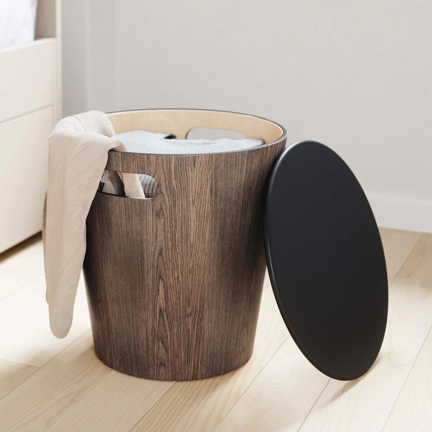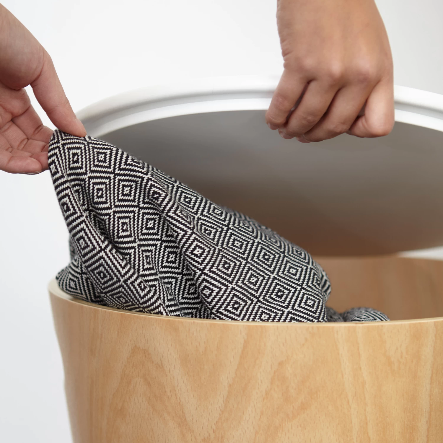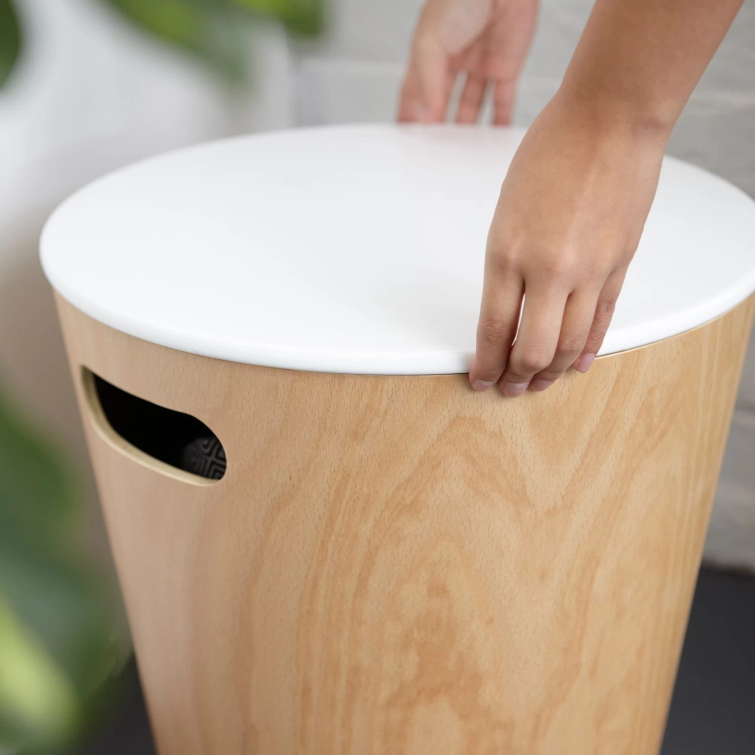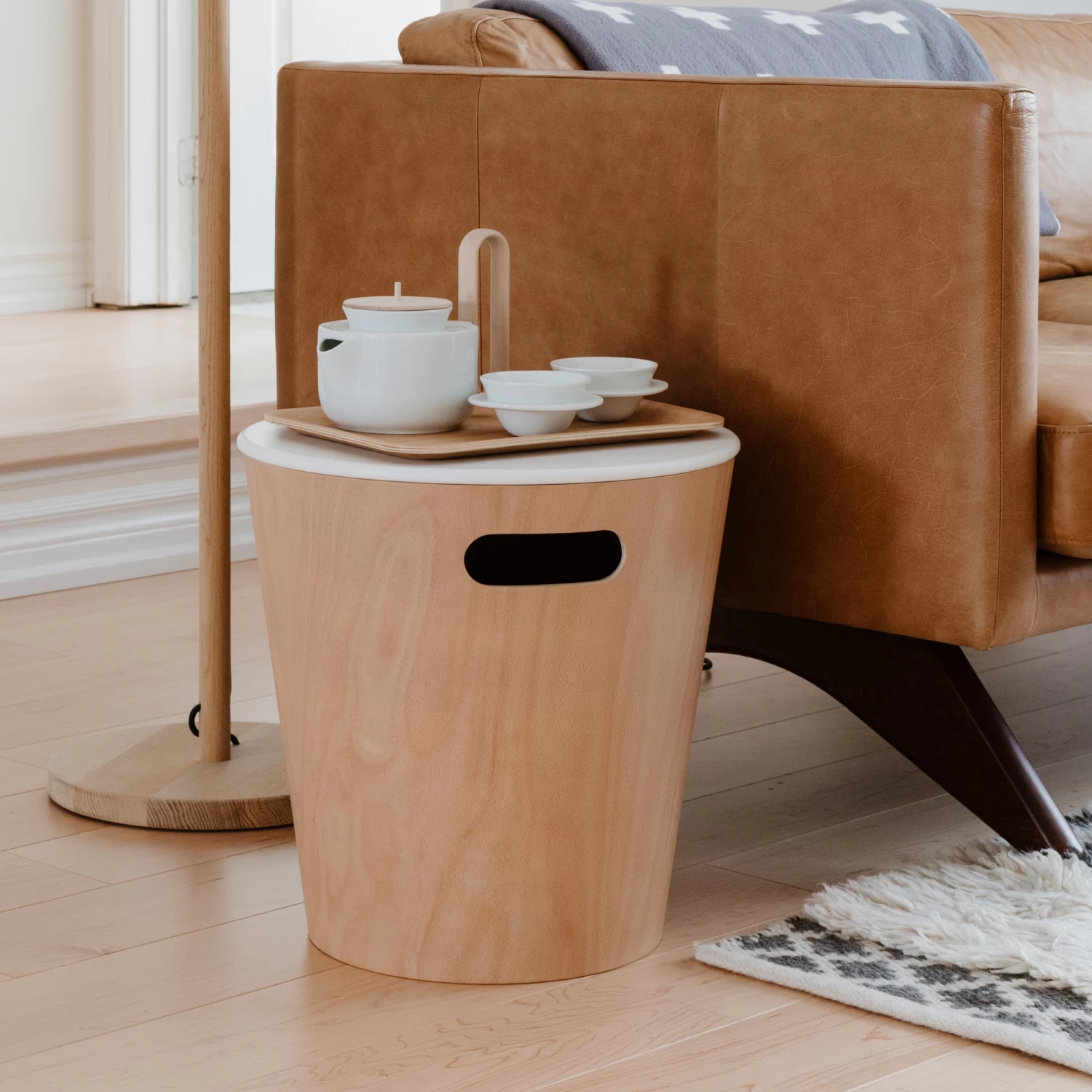 Inspired by the traditional ottoman, the contemporary and sleek storage stool comes with a natural wood finish and geometric shape. Crafted from treated natural wood, the curved stool comes complete with a crisp white lid enabling it to function as both a tabletop or seat. Integrated handles ensures easy movement around the house when required.